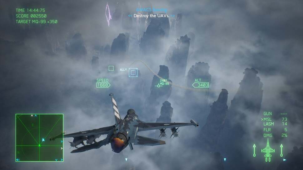 The environment plays a significant role this time as well. The terrain is much more detailed and easier to read from the skies with more structures and landmarks to fly through and around but it's the new cloud system that steals the show. The new volumetric clouds are gorgeous in motion but also integrated directly into gameplay. Tracking becomes more challenging in the clouds while ice and precipitation batter your fighter while zipping through especially thick cloud formations. There are even missions which rely on using cloud cover to avoid enemy radar. The beautiful volumetric rendering also increases the sense of parallax with the terrain below lending the game a boosted sense of speed. A new weather system is also included - bursts of strong wind can throw you off course now while bursts of lightning can temporarily interfere with your instruments - both are used to build tension during specific missions.