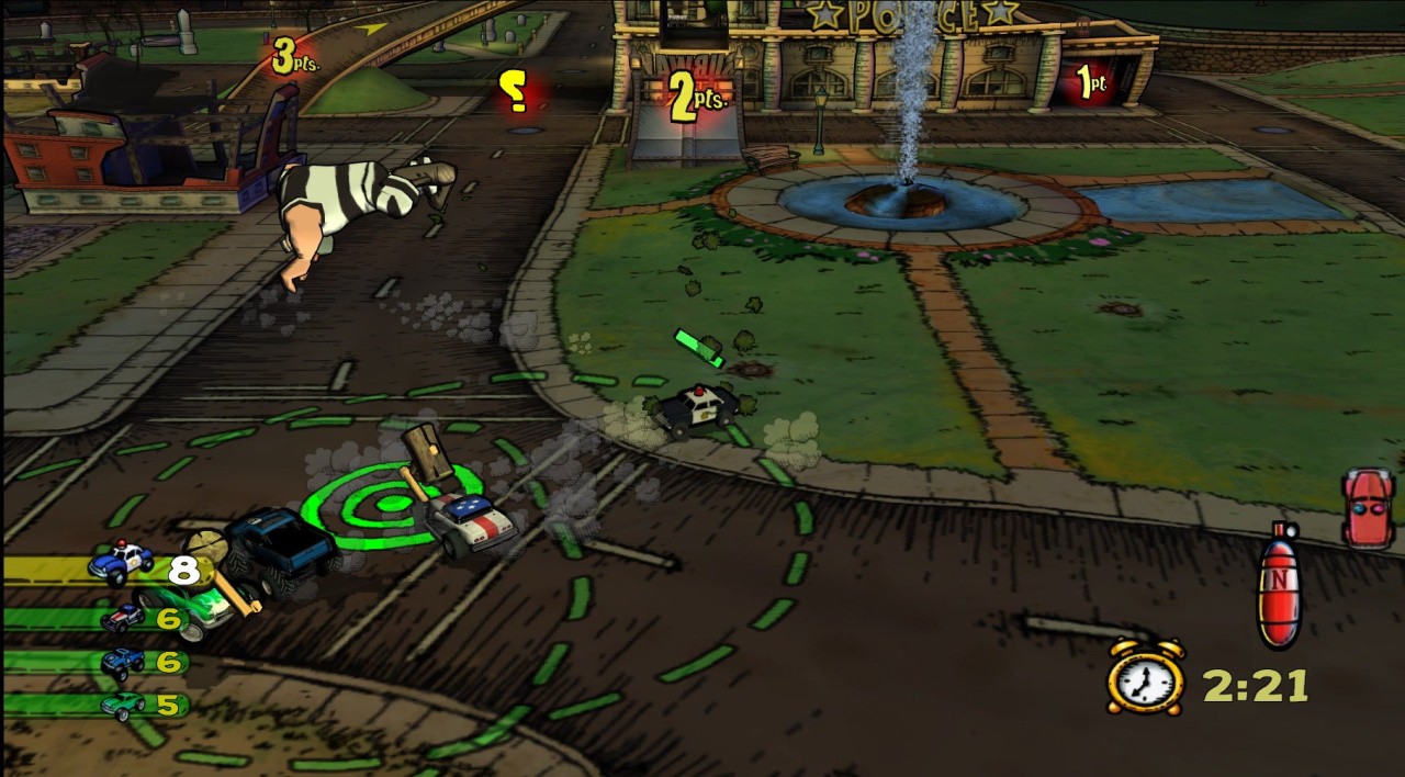 Calling All Cars! is supremely easy to get to grips with: chase down escaped cons across the map, then get them back to the cop shop to earn score. If one of your three cop competitors has beaten you to the prize, ram his vehicle or use one of three weapons to steal the perp away from him, then put your foot down and get back to the nick post haste to claim your points.