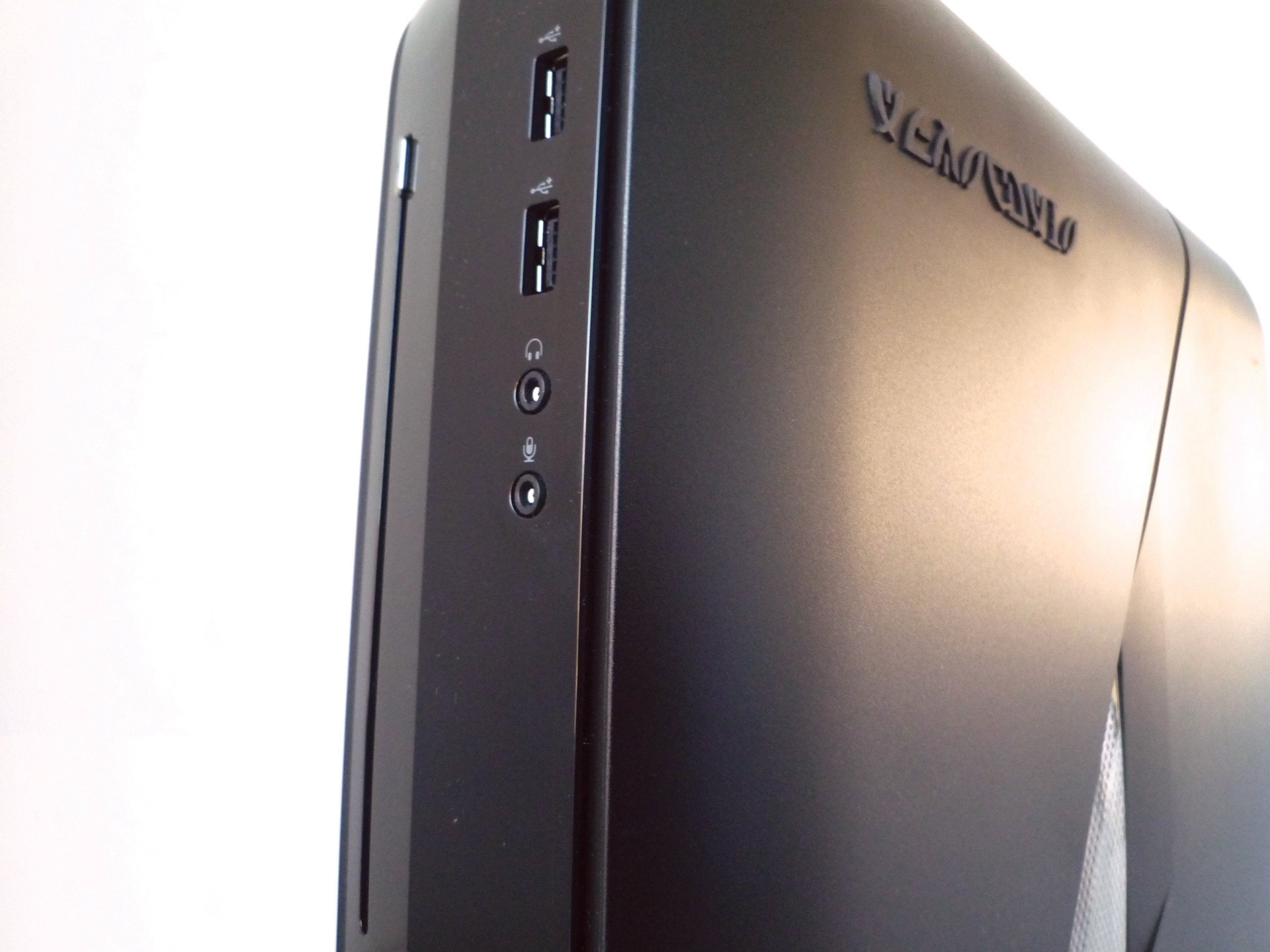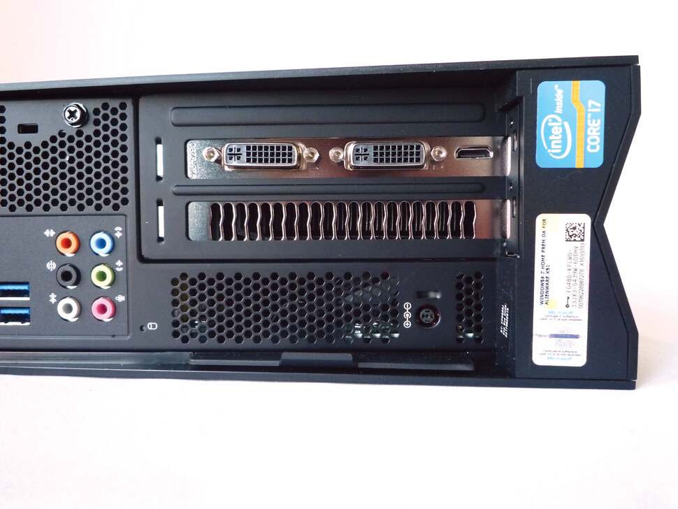 Back to the hardware itself, a look at the input selection shows no cutbacks have been made over a standard-sized rig. On the front you get two USB 2.0 ports, the optical media slot, and two audio jacks for headphone and microphone inputs. The back of the unit offers an impressive range of options for sound, with integrated 5.1 support via front, rear and centre speaker ports, optical output via toslink, and SPDIF digital output (coaxial). Also included here are an additional four USB 2.0 ports, two USB 3.0 ports marked by a blue fringe, an Ethernet port, and one mini HDMI 1.4 connector on the GPU that sits in parallel with two nearby DVI connectors.