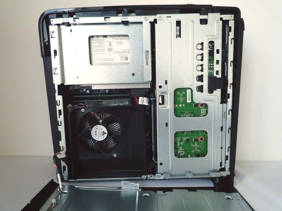 Removing a single black screw to the rear of the X51 allows you to slide the side panel forward and reveal its nicely organised innards. The first thing to point out is that this is not your ordinary SFF PC chassis layout, and all components lift or slide outwards with relative ease thanks to a simplified, compartmentalised design. A lot of time has clearly gone into tweaking and optimising this unit to make sure every square inch counts for something, starting with the three removable "upper layer" parts including the graphics card, optical drive bay and the CPU fan shroud.