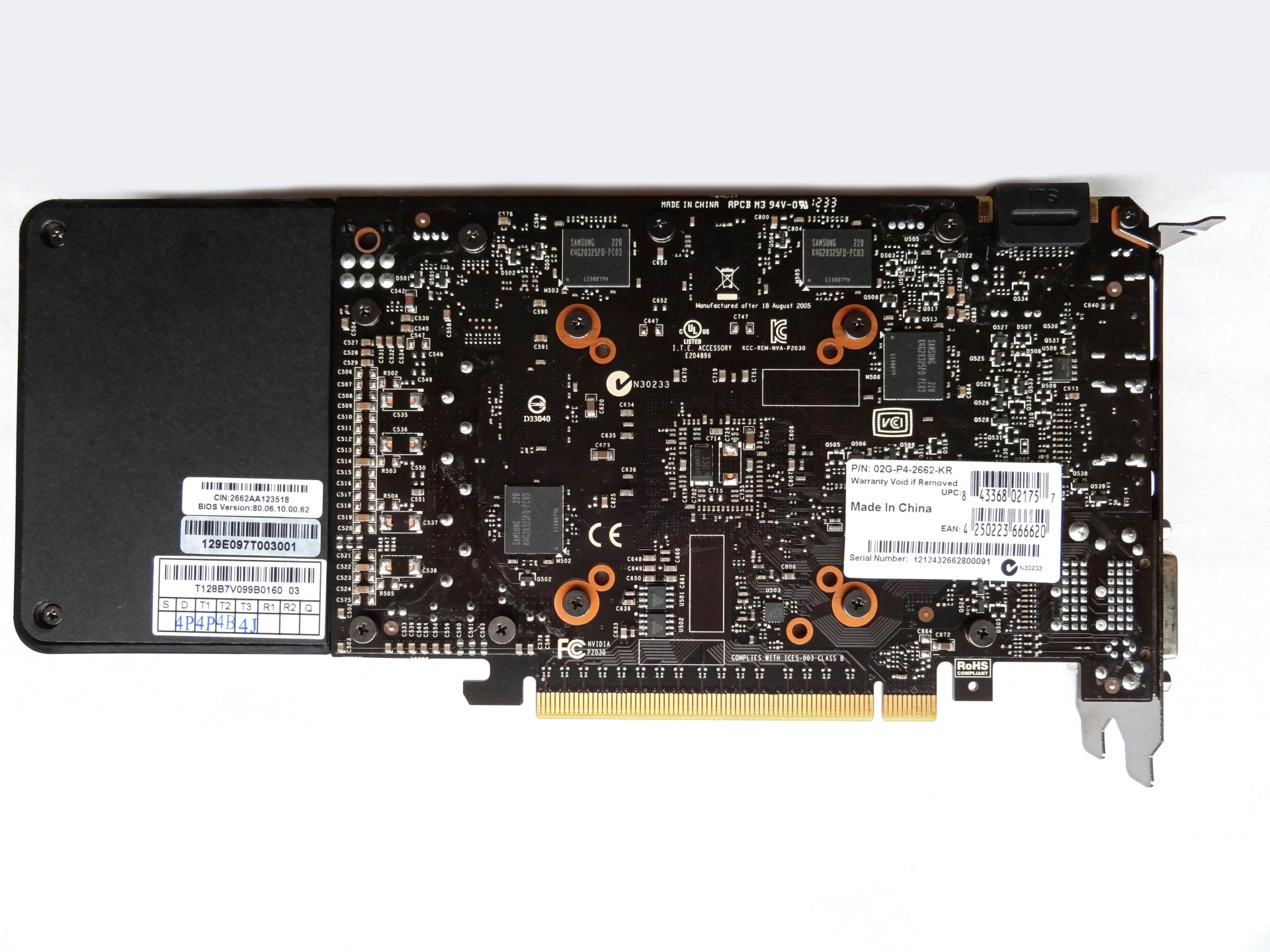 The card comes complete with all the connection standards common to the GTX 660 Ti; a dual link DVI-D being positioned above a DVI-I connection, with HDMI and DisplayPort 2.1 outputs to their right side. Four monitors can potentially run simultaneously through this setup, just as with the preceding cards - though power ratings have changed. The TDP for the card is listed at 140W, the lowest of all tested here, which draws its juice through just a single 6-pin PCIe power connector. It's rare that power usage will ever reach this peak value however, and the box requirements state the card requires just 24 amps off a single +12v rail on a PSU to run.