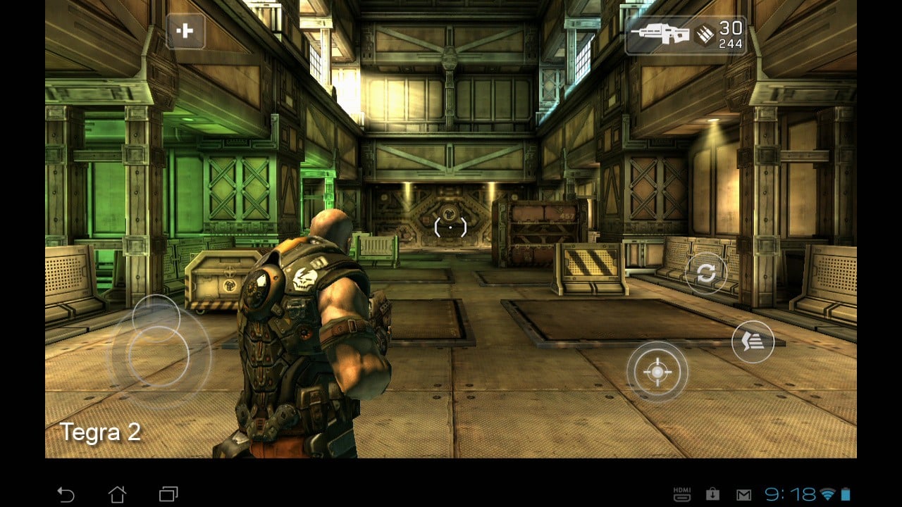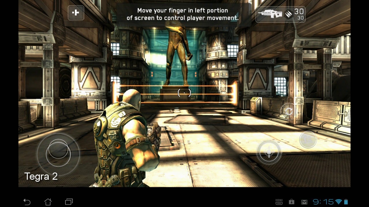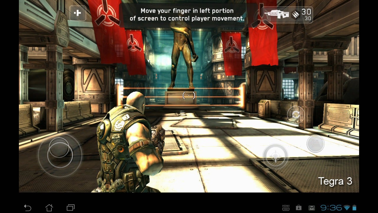 These extras do require GPU resources, however, and there are times when performance suffers as a result. The initial 30FPS update is easily disrupted on the Nexus 7 when there are multiple enemies on screen, and at this point the additional lag - in combination with reduced precision of using a touch-screen over a controller - begins to negatively impact on the gameplay. Despite these shortcomings, Shadowgun is eminently more playable than Sonic 4 Episode 2 in its THG guise, but once again the Tegra 3 version's bonus goodies come with a tangible impact to frame-rate.