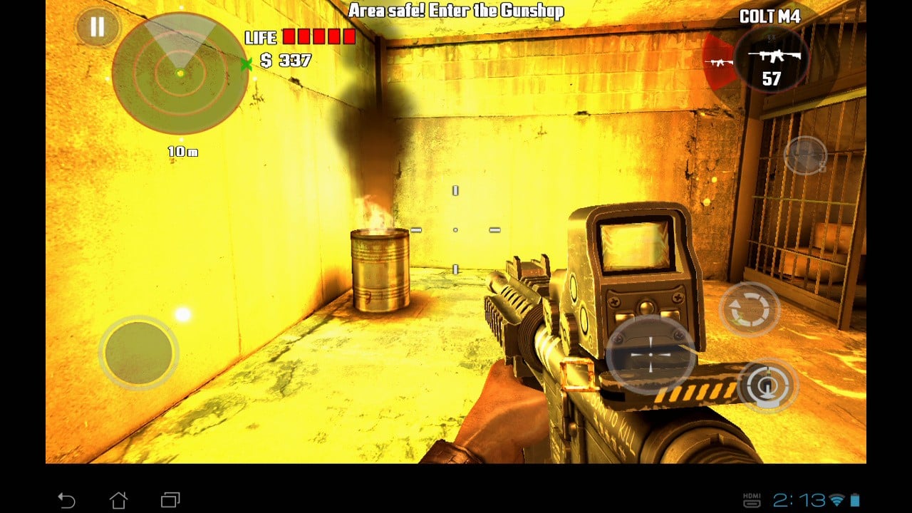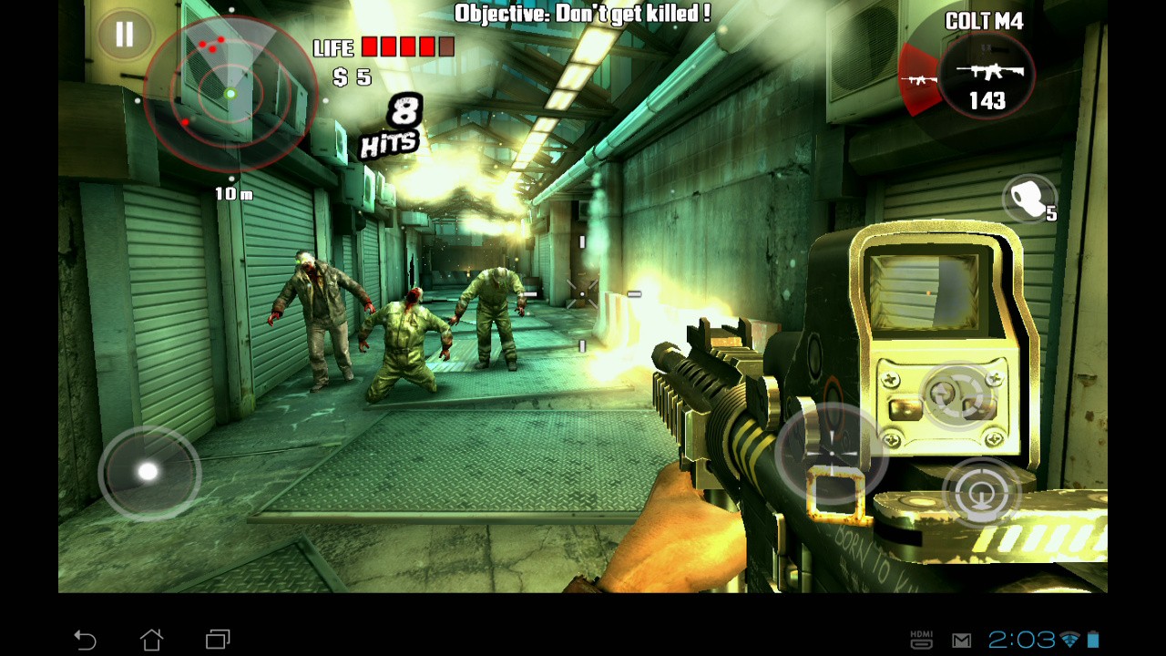 Conversely, Dead Trigger is plenty of fun, featuring water simulation and ragdoll physics exclusive to Tegra 3. The environments also benefit from smoke bellowing from pipes situated in the walls, and the lighting model is enhanced by use of lens flare and bloom, adding to the liberal use of shadows that bring depth to various scenes. The closed environments, which see you shuffled down linear paths (only branching out upon reach certain sections), also allows for some intricately detailed scenery going beyond the visual scope of many original Xbox titles. Character modelling is fairly accomplished too: low polygon counts are carefully disguised using normal maps, and use of additional shader effects further help to enhance the look of the undead.