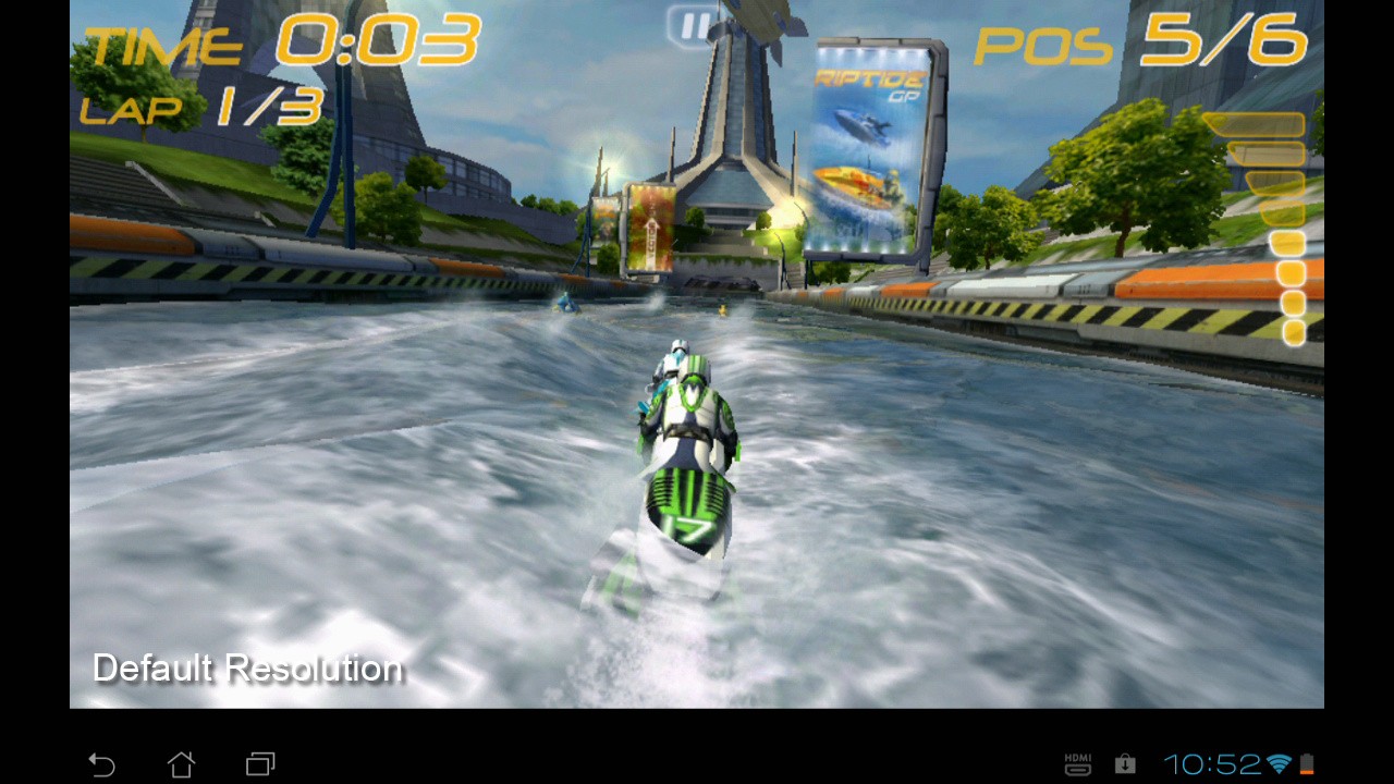 However, on the TF300 and Nexus 7, racing through open environments or speeding through large splashes of water can bring about dips in performance, but it's very rare to see the game go below the 40FPS mark. The effect is very similar to the Call of Duty titles, where small drops in frame-rate can often go by unnoticed - the "perceptual 60FPS" effect. However, achieving this performance level comes at a cost - Riptide GP is running at a sub-native resolution by default. It can be adjusted to native 1280x800 resolution but frame-rate drops down closer to 30FPS as a consequence. Our tests with the Transformer Prime show that the higher-clocked Tegra 3 chip manages to cope slightly better when under load (especially when maximum resolution is enabled) squeezing out a little bit more smoothness when the frame-rate is in flux, although the highs and lows are still very similar.