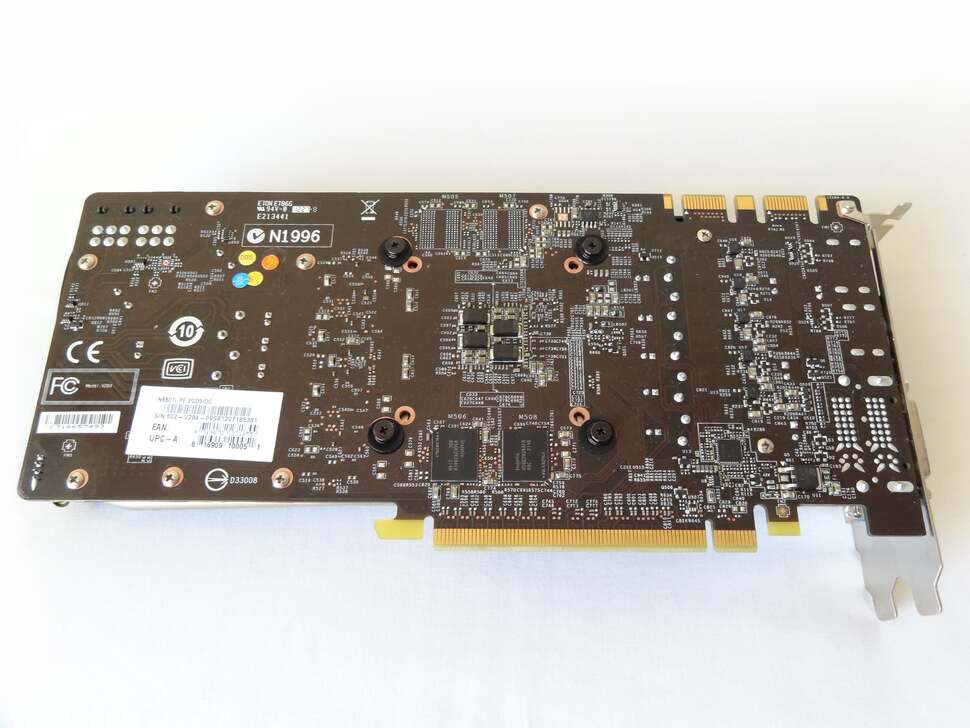 Turning it to its end, we see a flexible range of ports to work with that are identical to its more prestigious siblings. On the top row we have a dual link DVI-D, while on the bottom we see a DVI-I, and also means for DisplayPort 2.1 and HDMI connections. Just as with all entries in the GTX 6xx series, the card also runs up to four displays simultaneously, or three stereo 3D displays if you can afford all the necessary kit.
