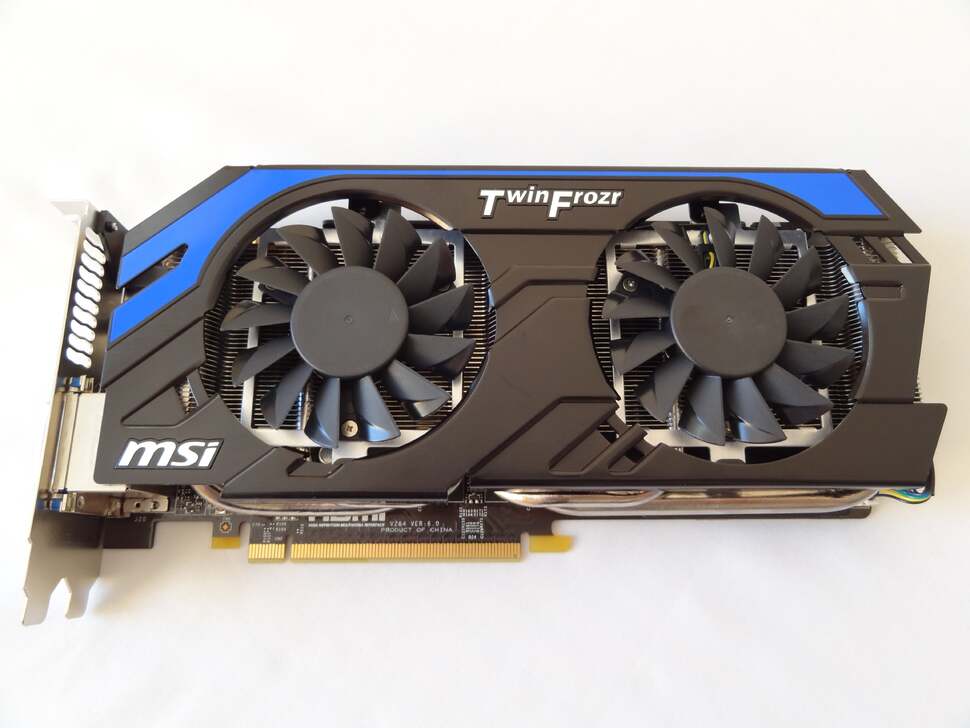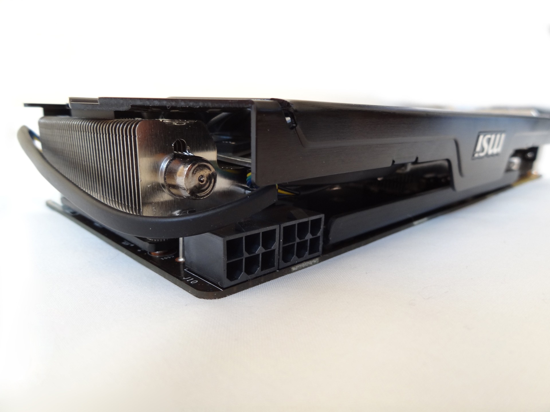 The build quality of our overclocked MSI unit feels very sturdy overall, and we notice no flex present while installing. The front plastic frame used to hold the cooling system can feel flimsy while handling some non-OEM cards, but this doesn't prove to be a problem at all here; the frame is bolted tightly to the PCB itself by four screws. Contained within it is the Frozr IV cooling system, taking the form of two 8cm fans that connect with a large aluminium fin array. This stretches across almost the entirety of the card's length, and at the bottom, we see four cooling pipes tucked around the front of its full PCIe 3.0 interface.