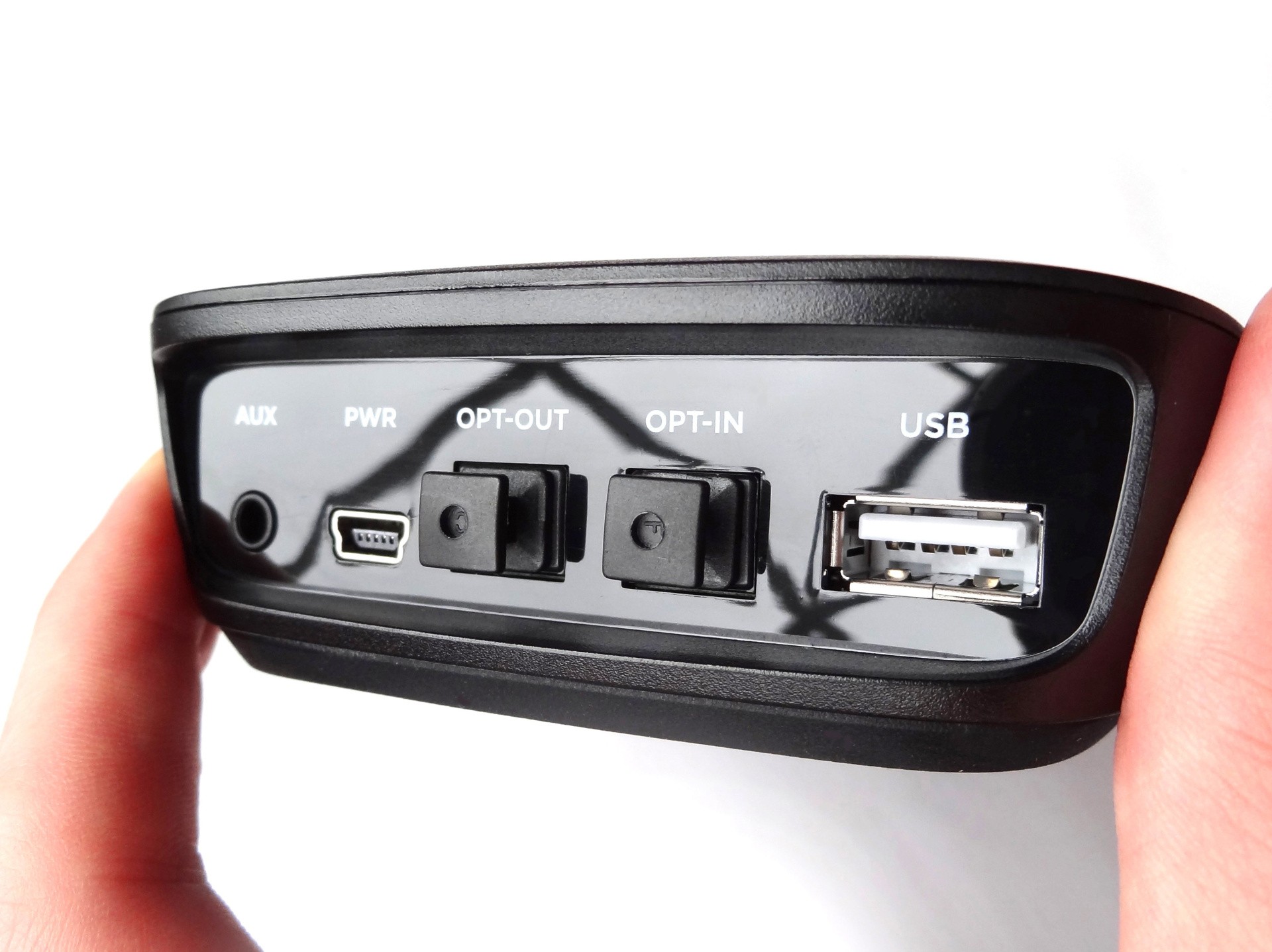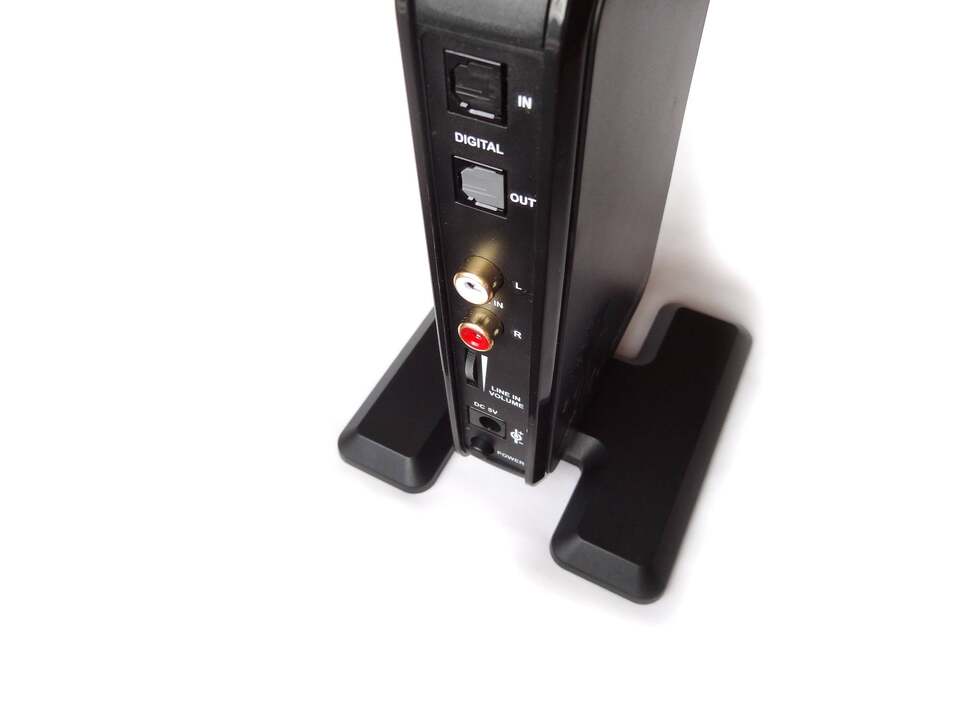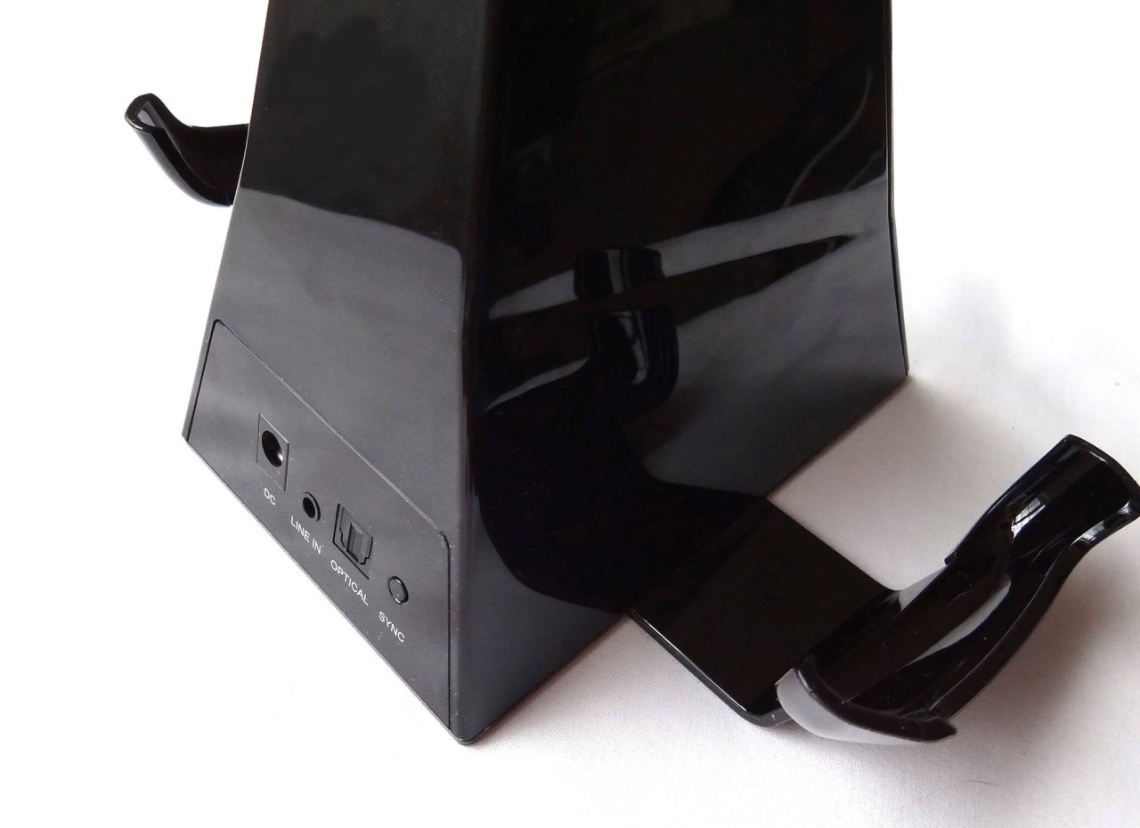 With that in mind, we take a look at the hardware making this possible. Supplied in the box is an upright-standing sound control unit, which also serves as the dock and wireless transmitter for the headphones. It has the optical input on the back, but rather than being powered by the mains, is conveniently driven by a USB port from any active device. The one other major difference between this unit and that of the Sharkoon's is the presence of a 3.5mm audio port on the front, allowing us to plug in any pair of headphones we may already have lying around.