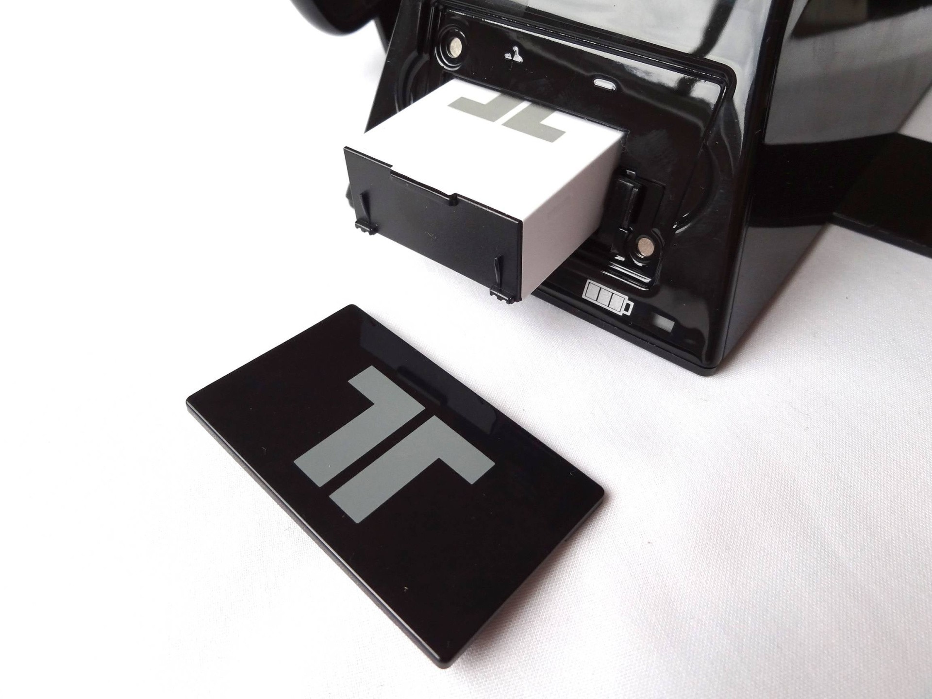 Both the headset and accompanying sound control unit are glossy black, with the latter standing like a large Toblerone with handles to each side. The design seats the each ear-cup nicely when docked, and while it doesn't charge from this position, it does the next best thing by integrating a battery re-charger in its centre, and including two lithium ion battery packs. The slot for these packs is accessible by a magnetic flap on the front, corresponding with a similar flap on the right side of the headphones, and the state of charge is indicated at the base of the unit by a red or green LED.