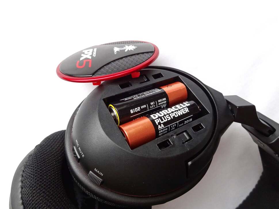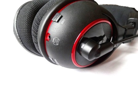 Now, onto sound quality. The use of a 2.4GHz RF signal for reception does have its issues here, and we find the headset crackle on occasions when it loses the line of sight of the transmitter. However, the distance it operates at is impressive when dealing on these terms; even at 10 metres we get a clear signal without any sign of interference. This is being tested in a relatively quiet neighbourhood though; your mileage may vary in densely populated areas since its frequency of choice happens to be common to many wireless routers. The other concern with going wireless is obviously battery life. Alas, power is leveraged through two AA batteries for this model, though we were pleased to get over eight hours of play from the box-in pair. Replacing these is relatively simple, being accessible by sliding down the red-lined plate on the left cup.