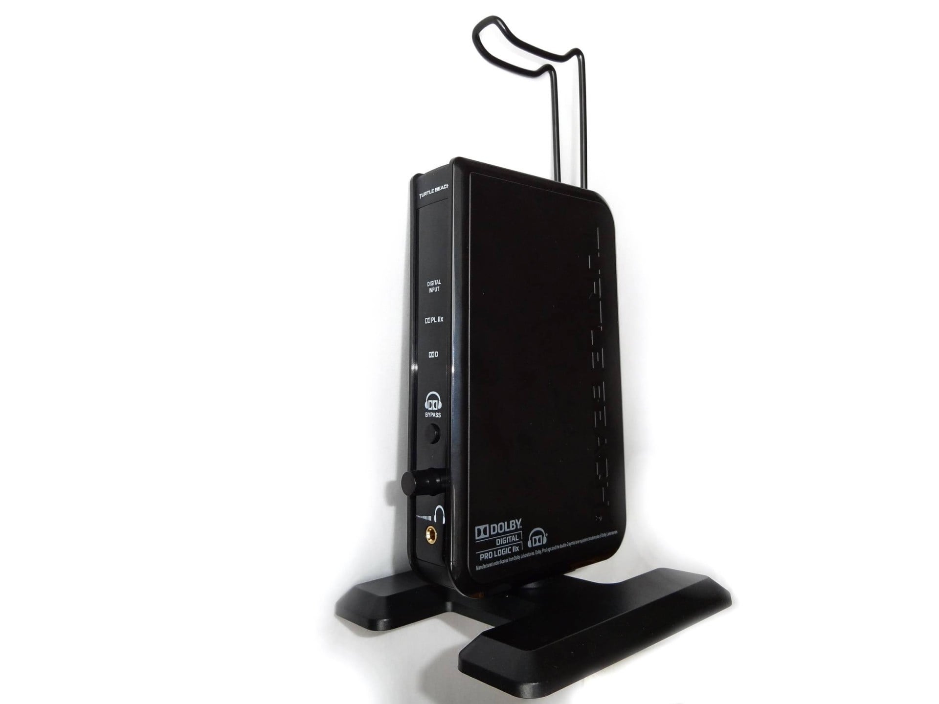 Besides the one extra wire needed either way, set-up is fairly elementary. The flat, black MixAmp unit is powered by USB, and once an optical cable is plugged in at both sides, we're ready to go. For the sake of added convenience, however, we have the option to place this compact unit inside the base of a supplied glossy headphone stand. This is assembled from three parts that permanently click together. Compared to the build quality of the rest of the outfit, this feels distinctly cheaper and less intuitive to work with, but once done, it's convenient to have a place to dangle the headset after use.