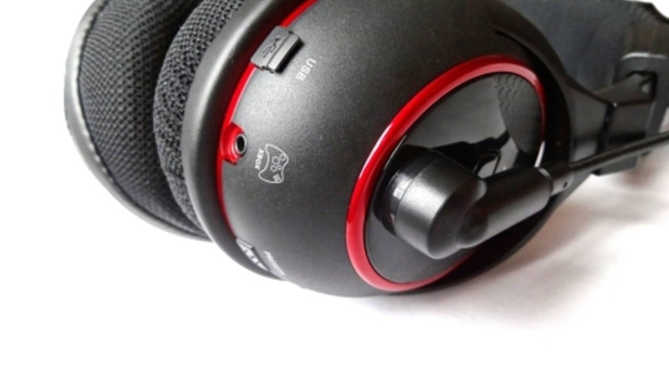 The headset is much lighter than the Sharkoon's, using a breathable nylon mesh for cushioning on the headband and ear-cups that reduces sweat-build up over hours of play. Pressure on the ears is minimal too by comparison, and we're pleased to see that the microphone can swivel up and down in parallel with its height, rather than just bend around. It's a comfortable set, and the red lining against its matte black plastics gives it a appropriately sleek look for its high price-tag.