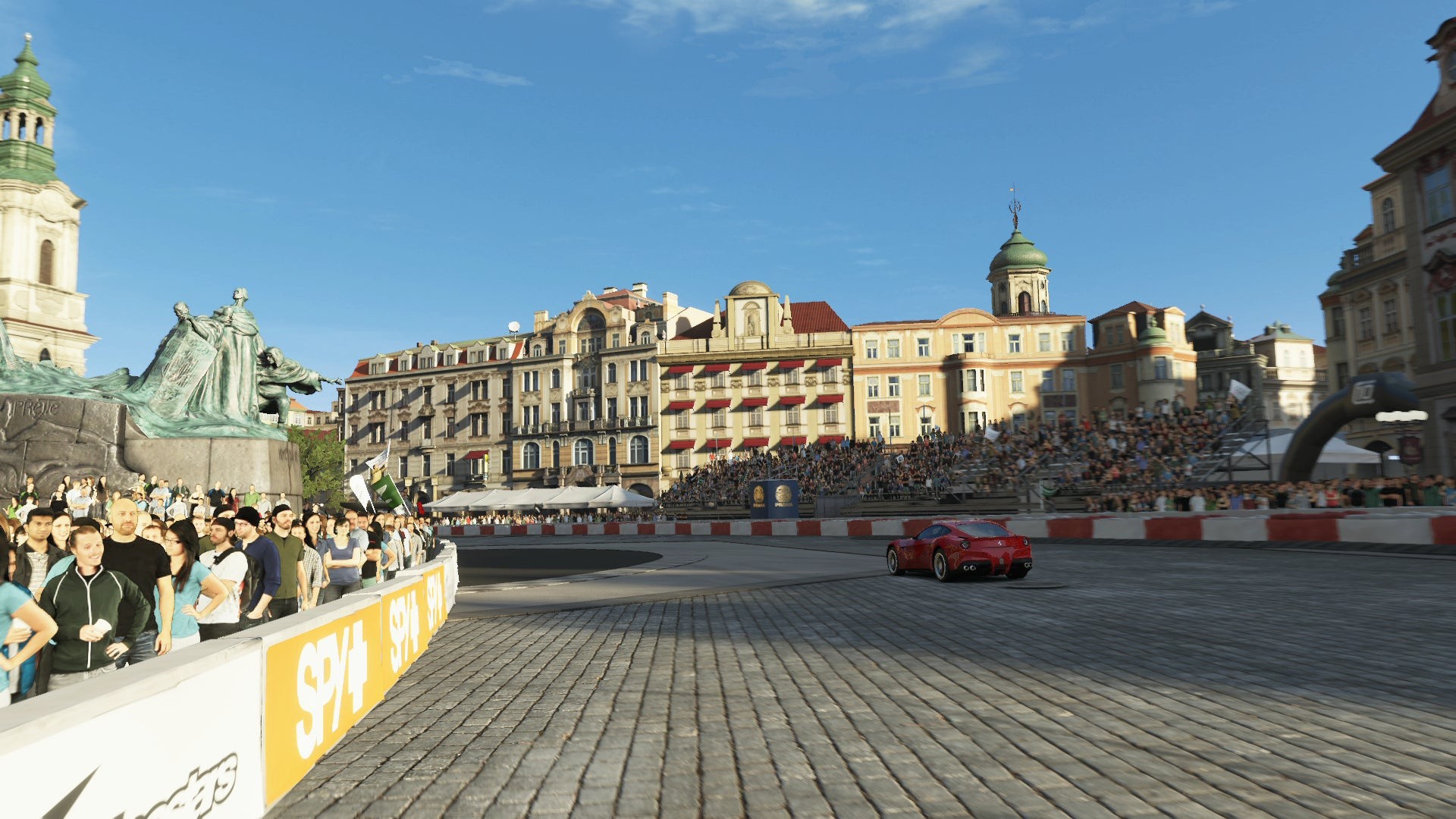 Right off the bat, it's clear the Prague circuit takes pride of place as Forza 5's showcase tutorial track; a winding brick road that tips the crest of a hill to reveal a magnificent Czech city centre. Compared to the E3 build on Xbox One, which showcased this very same stage, differences in the retail release mostly boil down to the toning down of bloom, resulting in the unusual white flashes also seen on textures in Forza 4. Meanwhile, there's a remixing of geometry, trees, and crowd positions - neither striking us as especially better nor worse for the end effect. On the plus side, the "pop-out" of geometry spotted in rear-view mirrors of the E3 build is less evident for the final release.