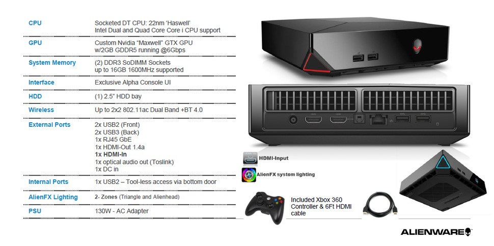 Originally planned as a Steam Machine running the Linux-based SteamOS, the Alienware Alpha is due for release very soon now, running Windows 8.1 and bundled with an Xbox 360 wireless controller in lieu of the delayed Steam controller. We took a look at the console-like PC at a recent meeting with Alienware and reckon it's got potential: the form factor is tiny, first impressions of the acoustics are good and the only unknowns concern the quality of its bespoke console-like interface (we weren't shown this, but some early shots are out there), and of course the raw performance of the internal components.