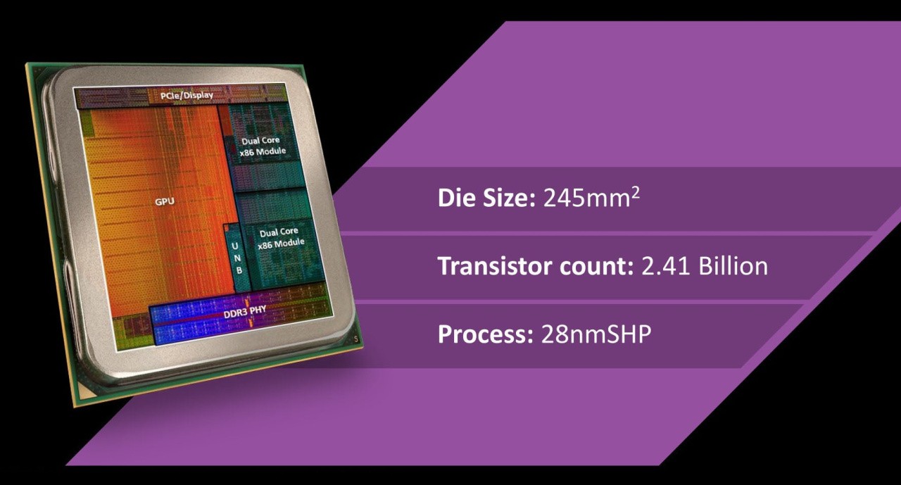 Four Steamroller cores across two modules, 3.3GHz, 3.8GHz Max Turbo (65W mode)