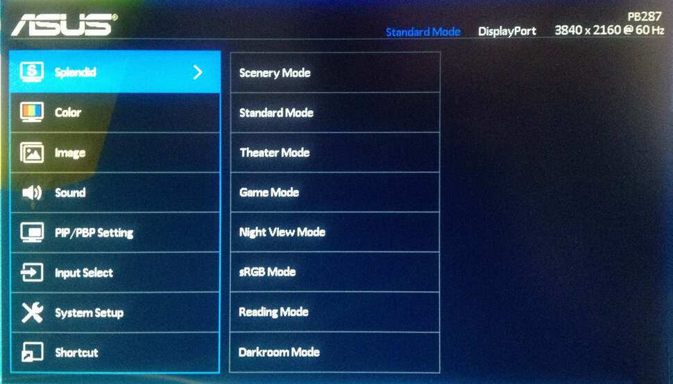 The PB287Q features a wealth of options located in its menu system. The "splendid" colour profile selection offers no less than nine different picture modes consisting of scenery, standard, theatre, landscape, game, night view, sRGB, reading and darkroom, each with various greyscale, colour and light output settings.
