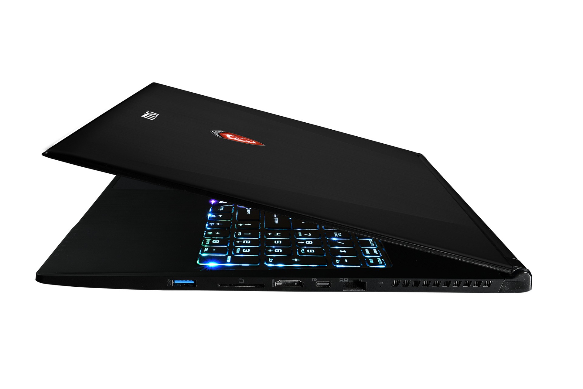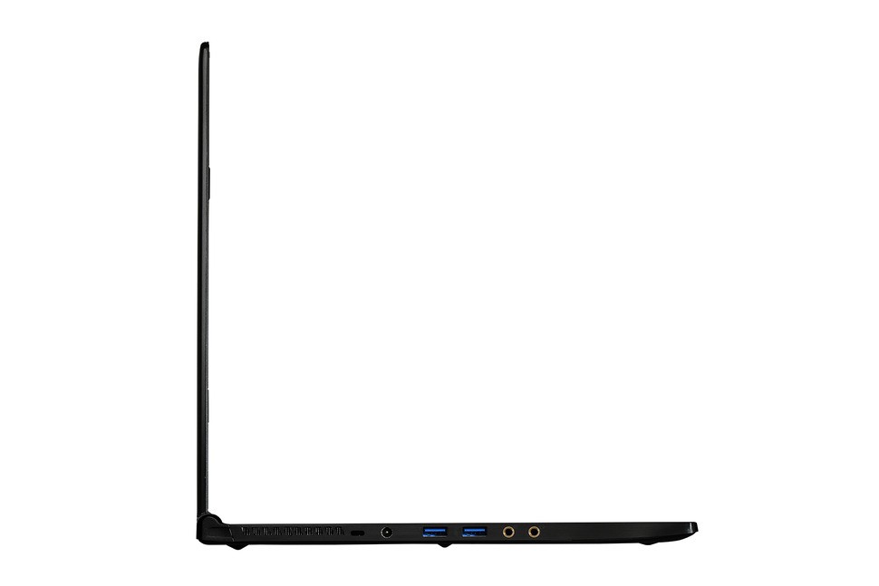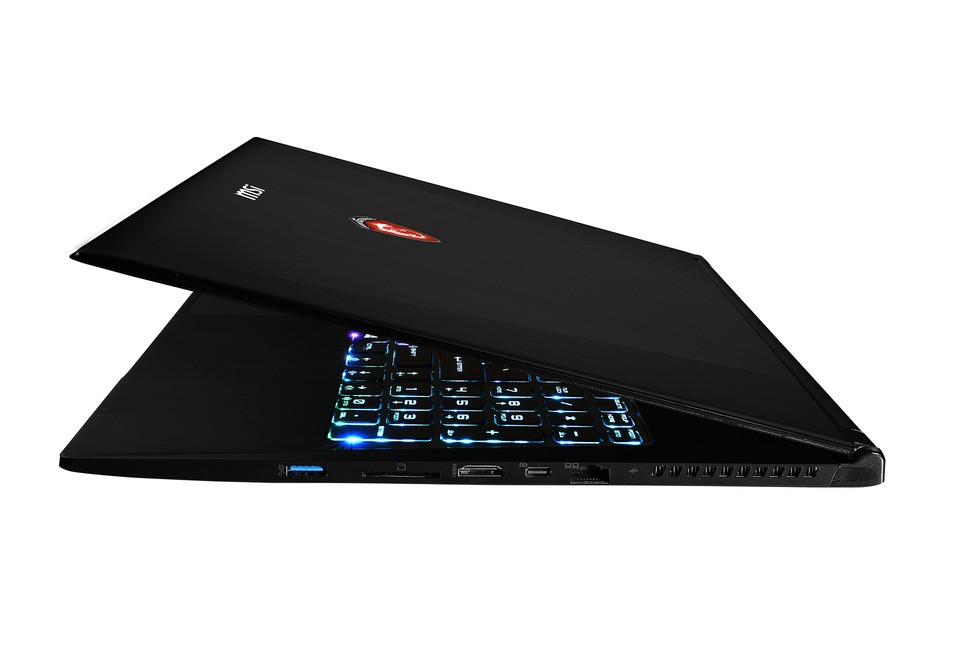 What we're looking at here is - according to MSI - the thinnest 15-inch gaming notebook on the market, with a case that's just 19.9mm high with the lid closed. Thanks to a magnesium chassis, it's also remarkably light too, weighing in at just 1.96kg. Despite this, it remains a fairly imposing presence - the GS60 Ghost has a 15.6-inch display and there's a pretty sizeable bezel there too, adding significantly to the overall footprint of the unit. On the plus side, this means that there is no real shortage of space for those all-important ports - we have HDMI and mini-DisplayPort alongside three USB 3.0 ports, line-out and microphone-in, plus an SD card slot too.