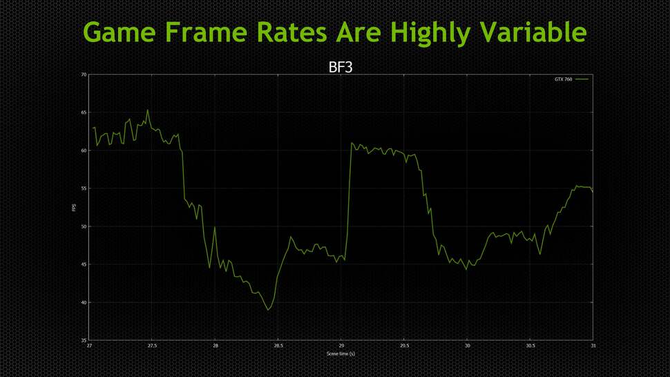 Perhaps the biggest surprise to come out of our hands-on testing sessions with G-Sync is the way it redefines frame-rate perception. We can tell when a game targeting 60fps falls short, but now we realise that this is mostly judged not just by the amount of unique frames generated, but also by the amount of duplicates and hence, the amount of stutter. G-Sync changes things up in that every frame is unique and there are no more dupes - it's just the frames are delivered pretty much as soon as the GPU is done processing them.