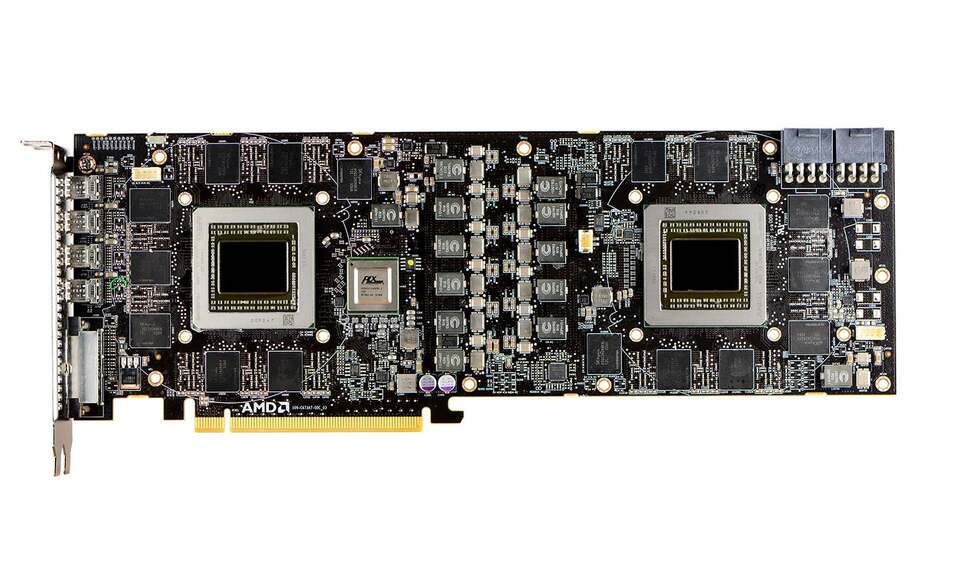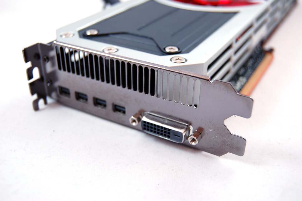 Connections are impressive, if minimalist. There's a single dual-link DVI socket and four mini DisplayPorts. There's a lack of HDMI here, but given AMD's contention that this is not meant for 1080p/1440p/1600p gamers, that's perhaps understandable - though we don't agree with the premise. Regardless, the ability to drive five different displays from a single card will probably be useful, especially given AMD's focus on its EyeFinity multi-monitor technology.