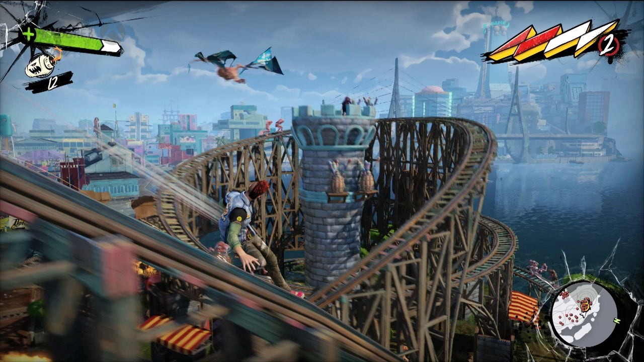 At its worst is a drop to 22fps during a combination of all these stress points. Sunset Overdrive also employs a very light adaptive v-sync, allowing the screen to very subtly tear within the top 10 per cent of the screen. Fortunately we count only a handful of genuine torn frames during the entire single-player session - something never visibly detected during our hands-on. It's an interesting technique that can help reduce latency - in a 30fps v-sync game, the developer has 33.3ms to render a frame. If it's running slightly over budget, the next frame will render at 50ms - by flipping the framebuffer late, latency can be decreased and stutter reduced.