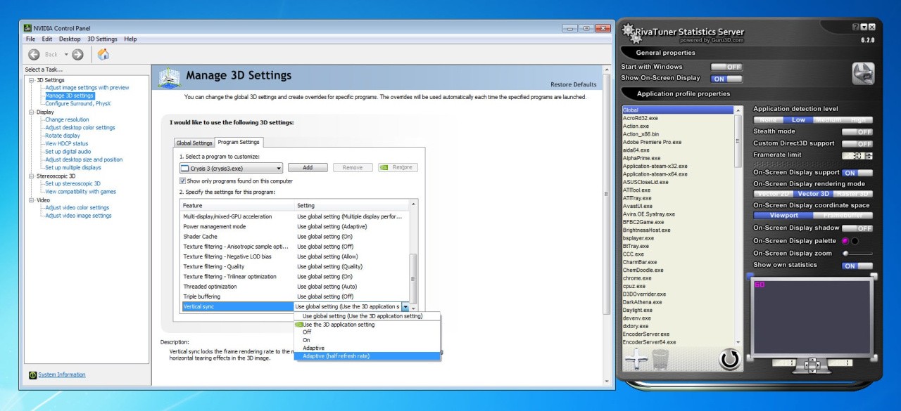 So how can you impose your own frame-rate limits on your games and make sure that new frames are evenly paced? There are a number of solutions out there, but we tend to stick to a brace of proven technologies. First of all, for Nvidia owners, the GPU control panel offers up a number of v-sync options - "half-rate adaptive" is the one you want. This imposes a console-style refresh onto your PC titles - games are locked at 30fps, but if render time exceeds the allotted 33.33ms per frame, you'll get some screen-tear until the problem area cleans up. This should only happen very rarely, assuming you are realistic with your quality settings.
