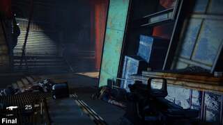There are other technical changes too, subtle as they are. Effects such as anisotropic lens flare are also pared back, as sported by the floating Crank enemies and orange glow-sticks littering each room. Actual alpha quality for gunfire remains on an even keel though, and destruction effects are only altered slightly - with physics still in full play for ruined enemies. That said, a chromatic aberration effect is brought in for the final release, mainly flaring up towards the screen's edges.