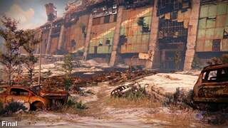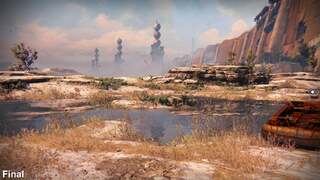 Nevertheless, the main thrust of Destiny's technical evolution is clear, beginning with an update to textures in the PS4 final build - the most far-reaching change following Destiny's E3 2013 reveal. Normal maps see an update for the positive, with the Cosmodrome entrance itself given a rusted, peeling exterior that replaces the simpler, grime-splattered surface of the original demo. Out go the dust floor textures too, where now we have more defined bump mapping for underfoot cracked soil. Elsewhere, we have textures that are simply a worthy alternative; neither truly better or worse than what came before. One side-effect, however, of exaggerating the area's state of ruin is a toning down of reflections across vehicles. In this case, what might be viewed as a technical downgrade is nothing more than a revision of material properties - rusty vehicles in a post-apocalyptic world probably aren't going to be bright and shiny.