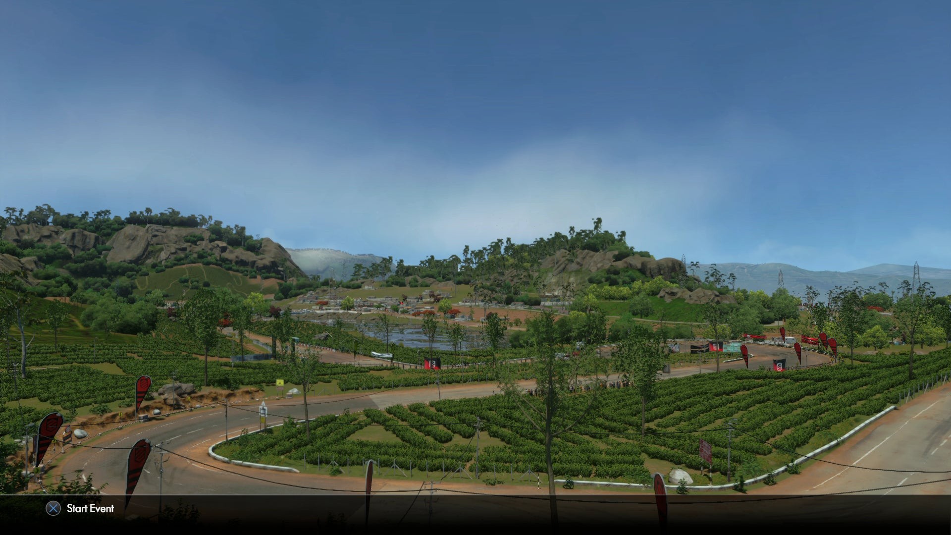 The opening pre-race sequences demonstrate this perfectly with the camera panning across locations that are large in scale and intense in detail. Mountains and valleys are filled with trees, while buildings, walls, fences, and other man-man structures are seen scattered across the landscape far into the distance. The rocky hillsides and off-road terrain display cracks and bulges that can be seen from the sky and only get more intricate as the camera moves down to the ground level. The complexity here continues once racing begins, where it's possible to appreciate the high quality models and textures on offer, along with additional effects such as leaves, dust, and confetti that sporadically litter the track while driving.