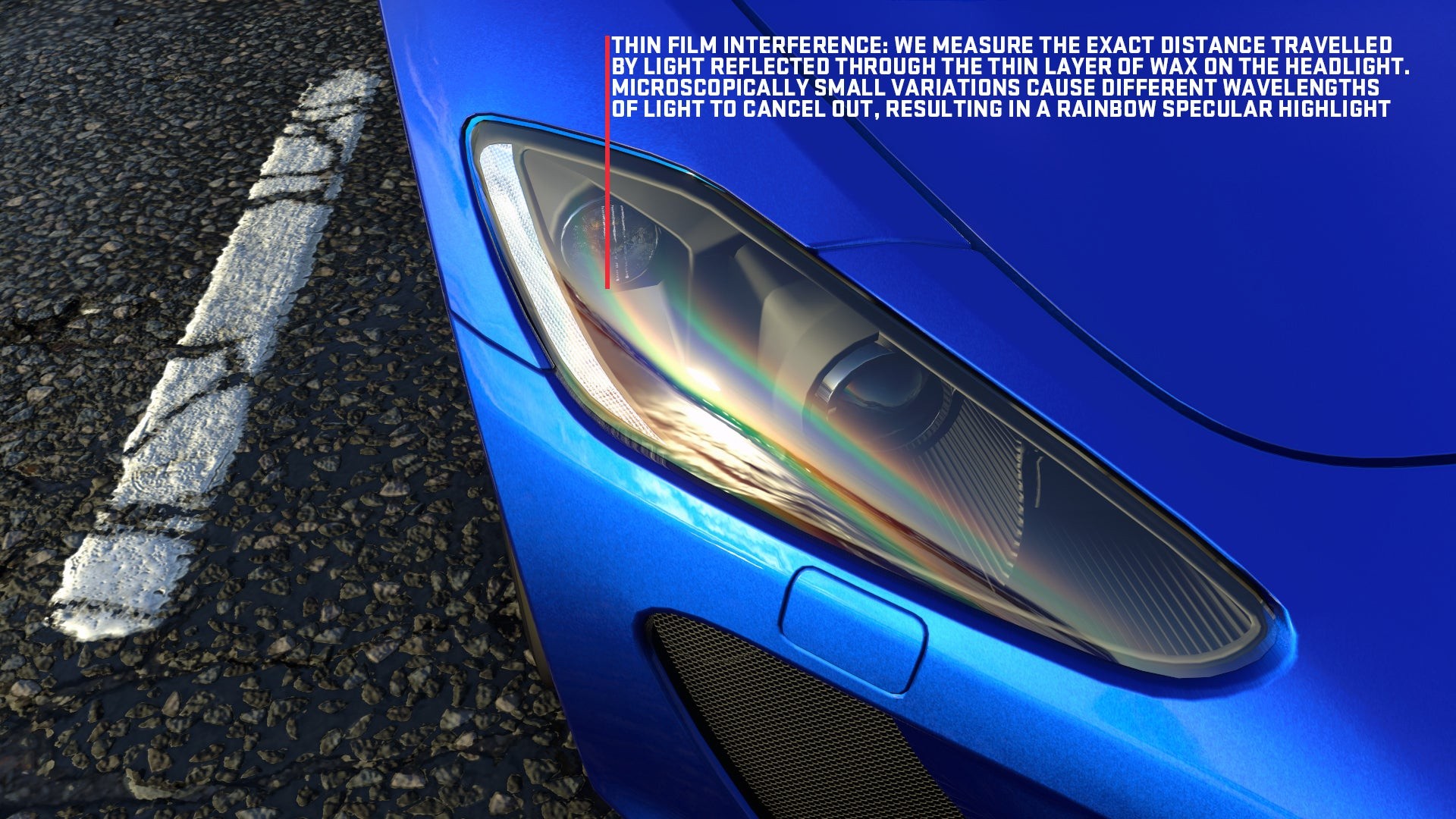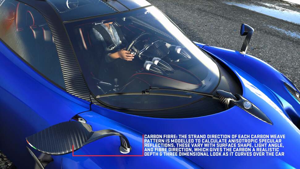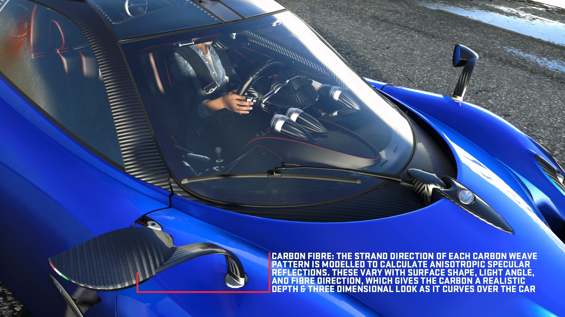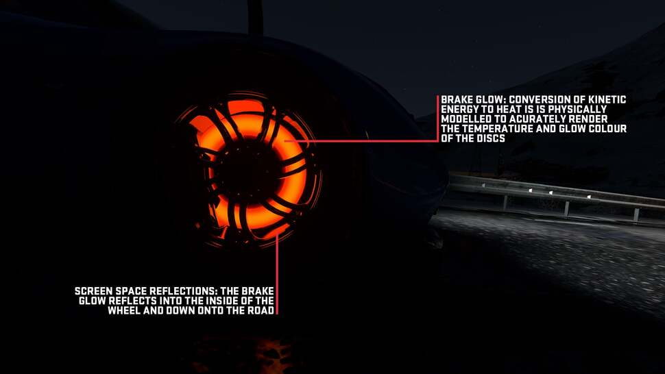 The impressive material properties also extend to the cars, both inside the cockpit and on the outer bodywork: scratches react differently to light than the shiny paintwork, while rubber, plastics, glass, metal and paint layers are all accurately simulated according to how light is reflected. Headlights also simulate how light from both the bulb and environment is scattered and refracted through the plastics, and this is joined by screen-space reflections used on the brake lights, wheels and on the road itself. Inside the cockpit, dirt build-up on the windscreen causes light to scatter across the surface, while in bright conditions the dashboard also reflects onto the glass. We also see the exterior of the car reflected on the internal carbon fibre panels too.