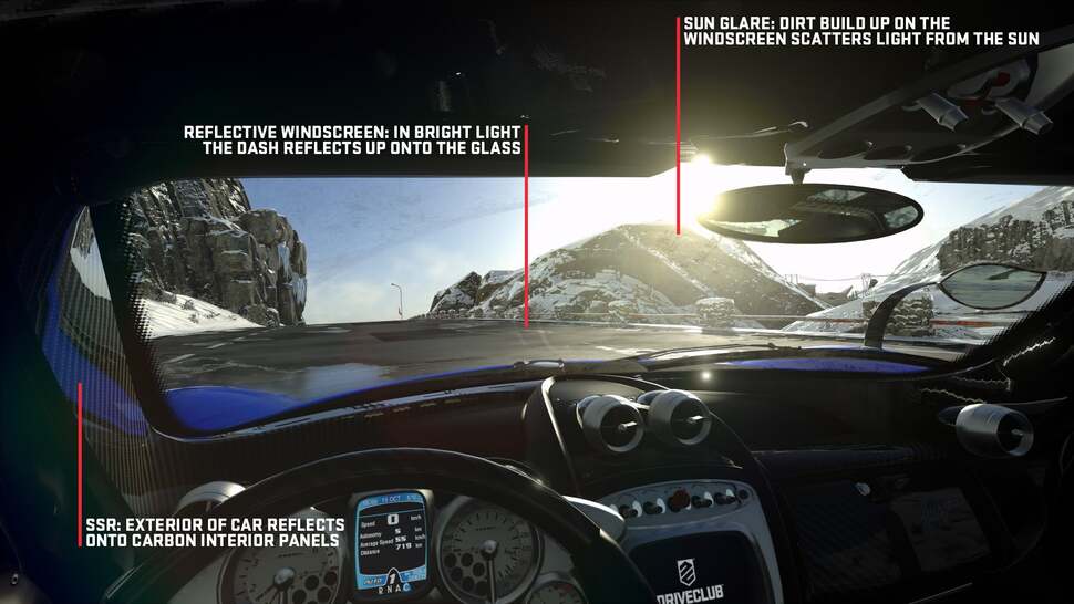 With DriveClub, one of Evolution Studios' main goals was to keep the experience feeling interesting and fresh between races, and this ideology shapes the complex graphics engine powering the game. The in-house game engine features completely dynamic effects and a range of different rendering set-ups to help realise a variety of environment and racing conditions, from dynamic time of day and weather, to how different objects react to the surrounding lighting. Everything rendered in DriveClub is real-time with forward, deferred, and tile-based systems working in concert to create realistic-looking locations that have plenty of atmosphere.