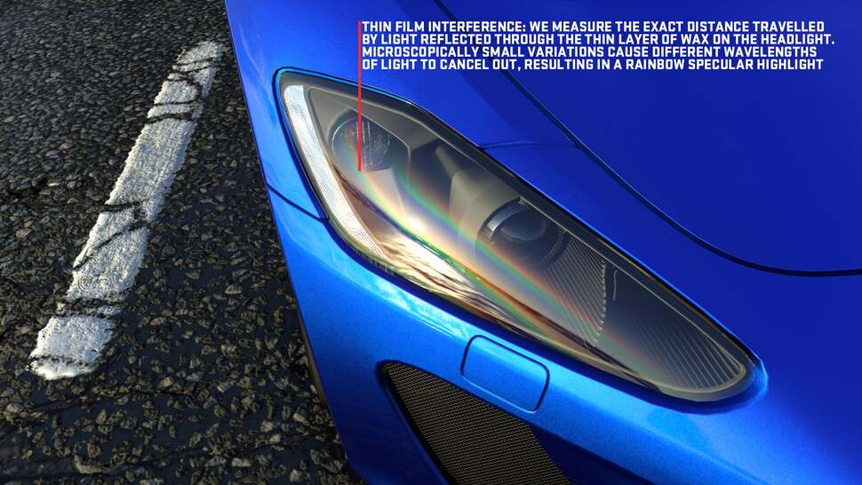 At the heart of Evolution Studios' push for graphical authenticity is the use of physically correct materials across all surfaces in the game, which react differently according to various lighting conditions or effects. This means that rocks display a different type of sheen to tarmac, plants, or plastics in wet conditions, while the textured surfaces of carbon fibre and rubber appear to diffuse light more strongly than smooth surfaces.