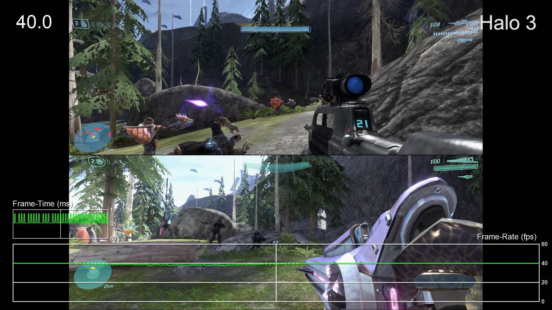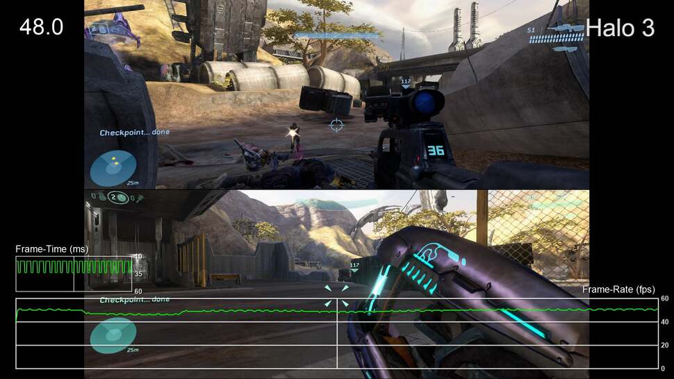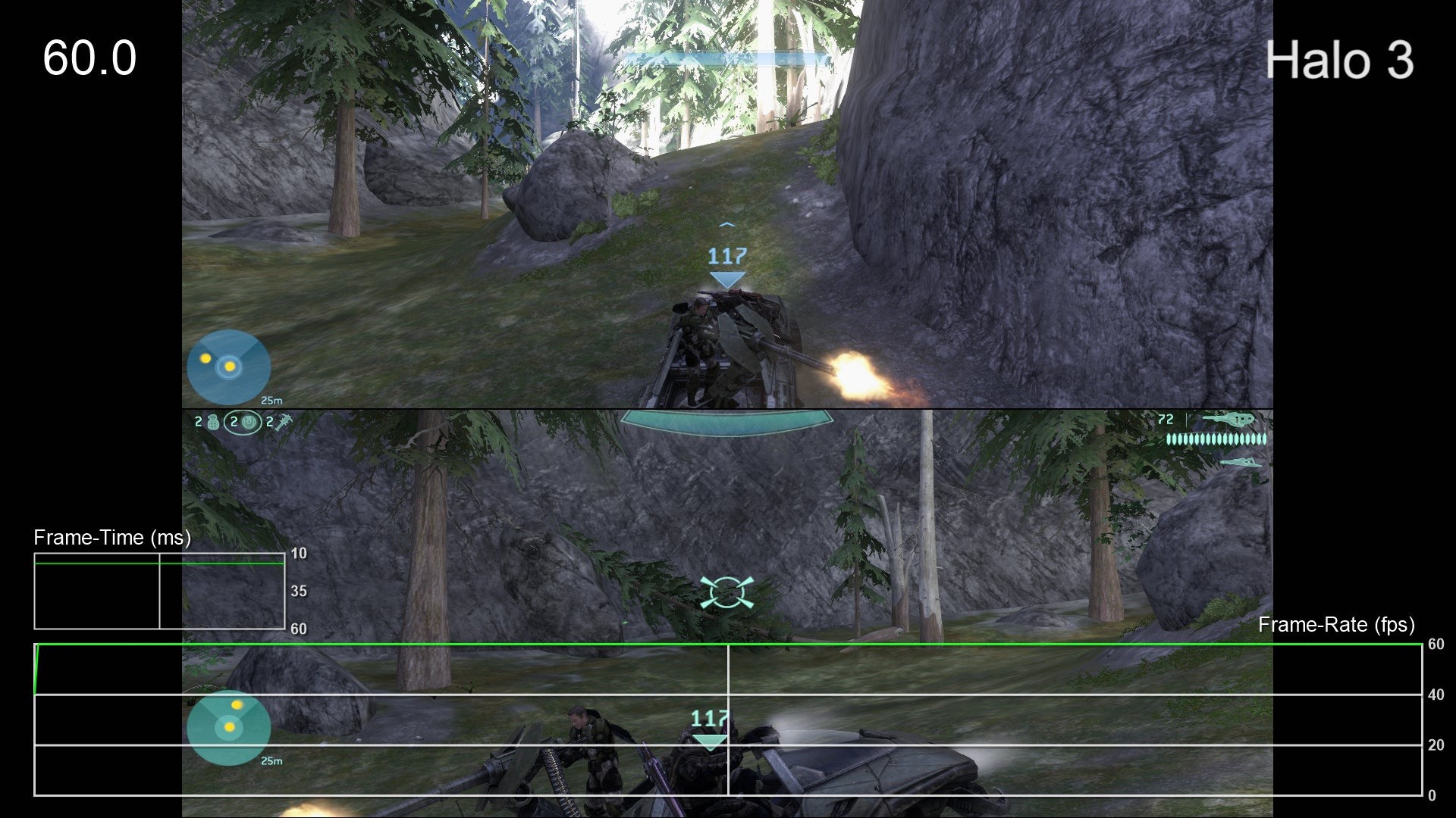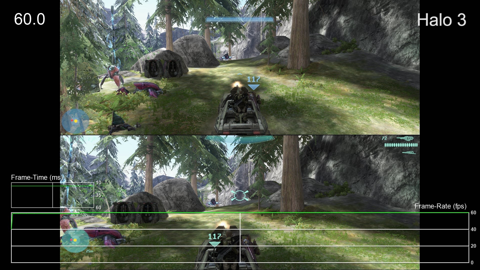 - Yup, it's an issue here as well. Fortunately, Halo 3 runs better than any of the other games in split-screen mode, providing a fairly solid 60fps experience. There are definitely dips, especially in The Covenant mission, but it's very playable. The game uses the same settings as the original 360 version in this mode, however, with black bars filling the left and right of the image, creating smaller playable windows for each player. Furthermore, the level of detail is pared back, resulting in grass and objects that pop-in around the players' feet during gameplay.