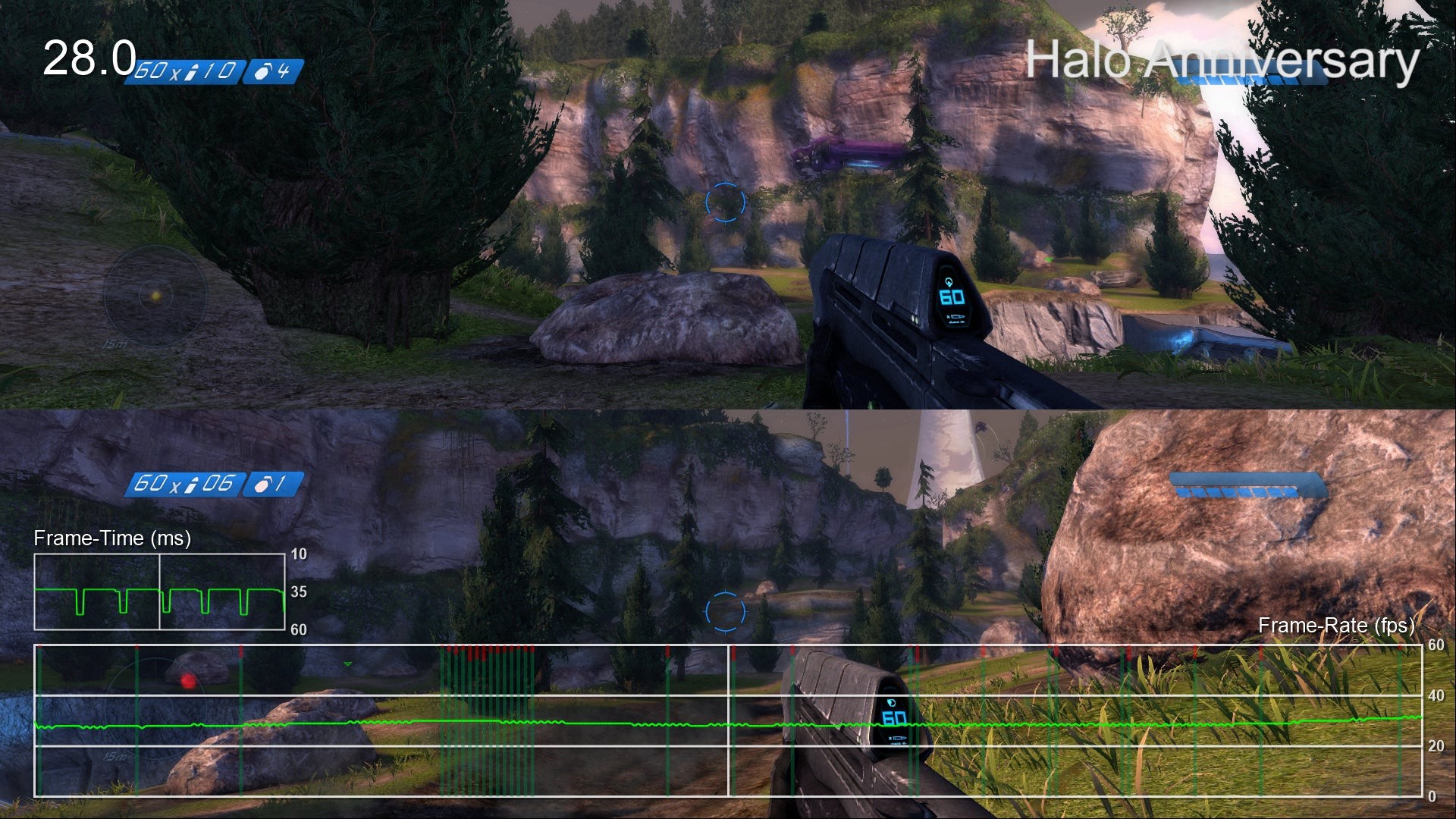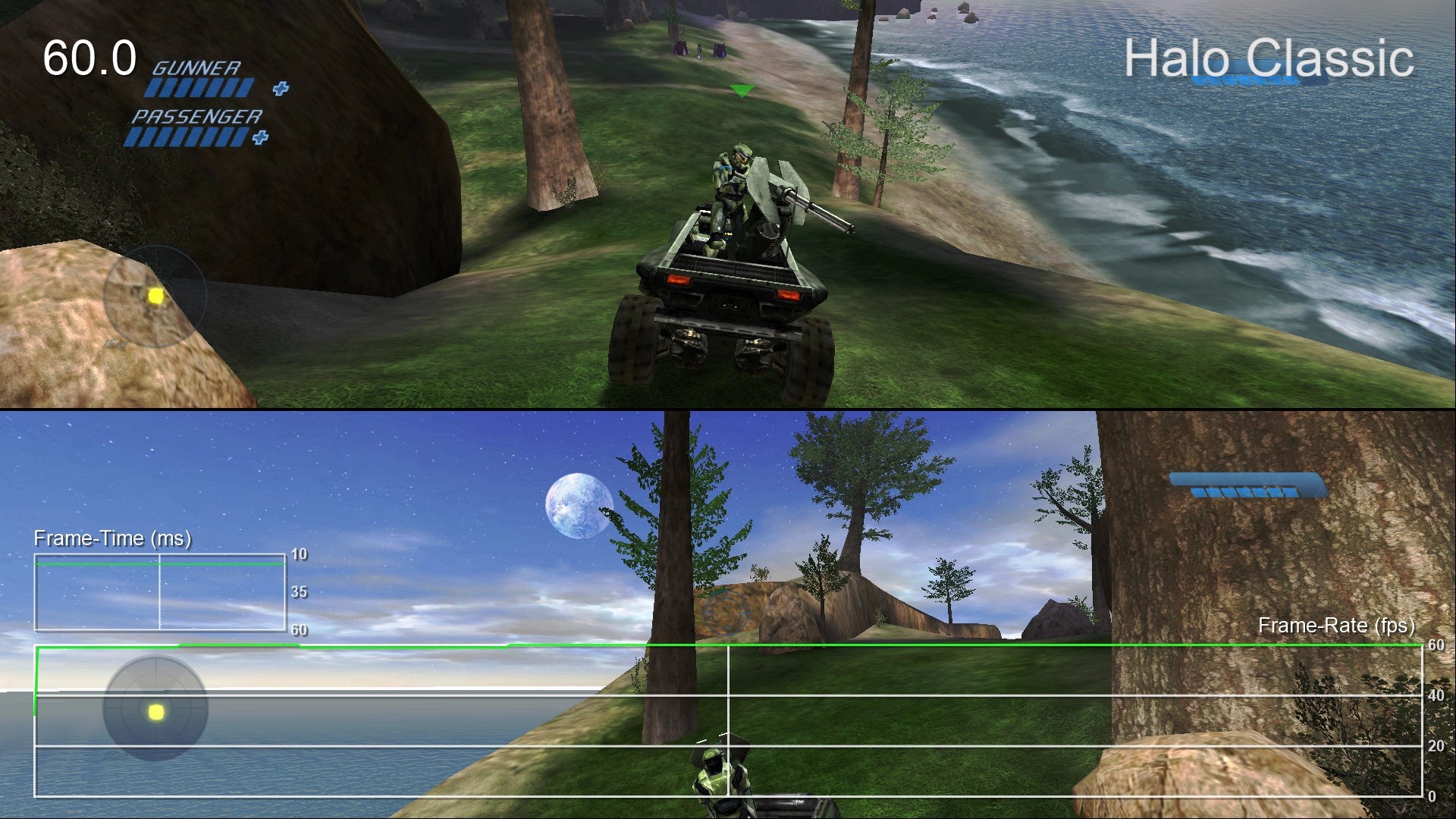 - Halo CE multiplayer was built on split-screen and it's how many people played it originally. This feature is thankfully maintained here, but it doesn't work as well as one might hope. In classic mode, performance is mostly acceptable with a slightly unstable 60fps, but in Anniversary mode it can become downright choppy. Frame-rate dips below 30fps occur regularly with torn frames appearing primarily along the top half of the screen (sorry, player one). It feels jittery and difficult to enjoy when using this mode and we'd have to recommend sticking to classic visuals if that's how you want to play. At least it uses a rather wide field of view that doesn't restrict either players' viewpoint.