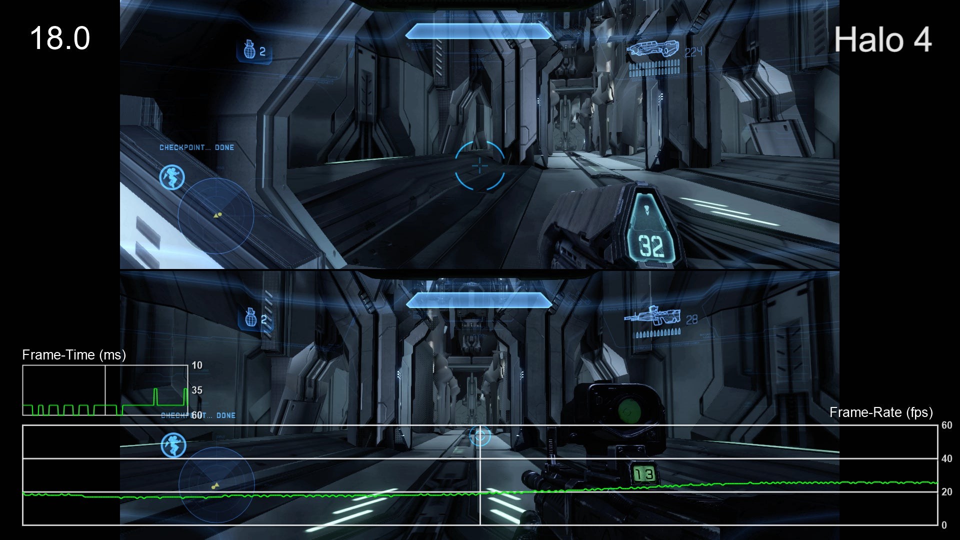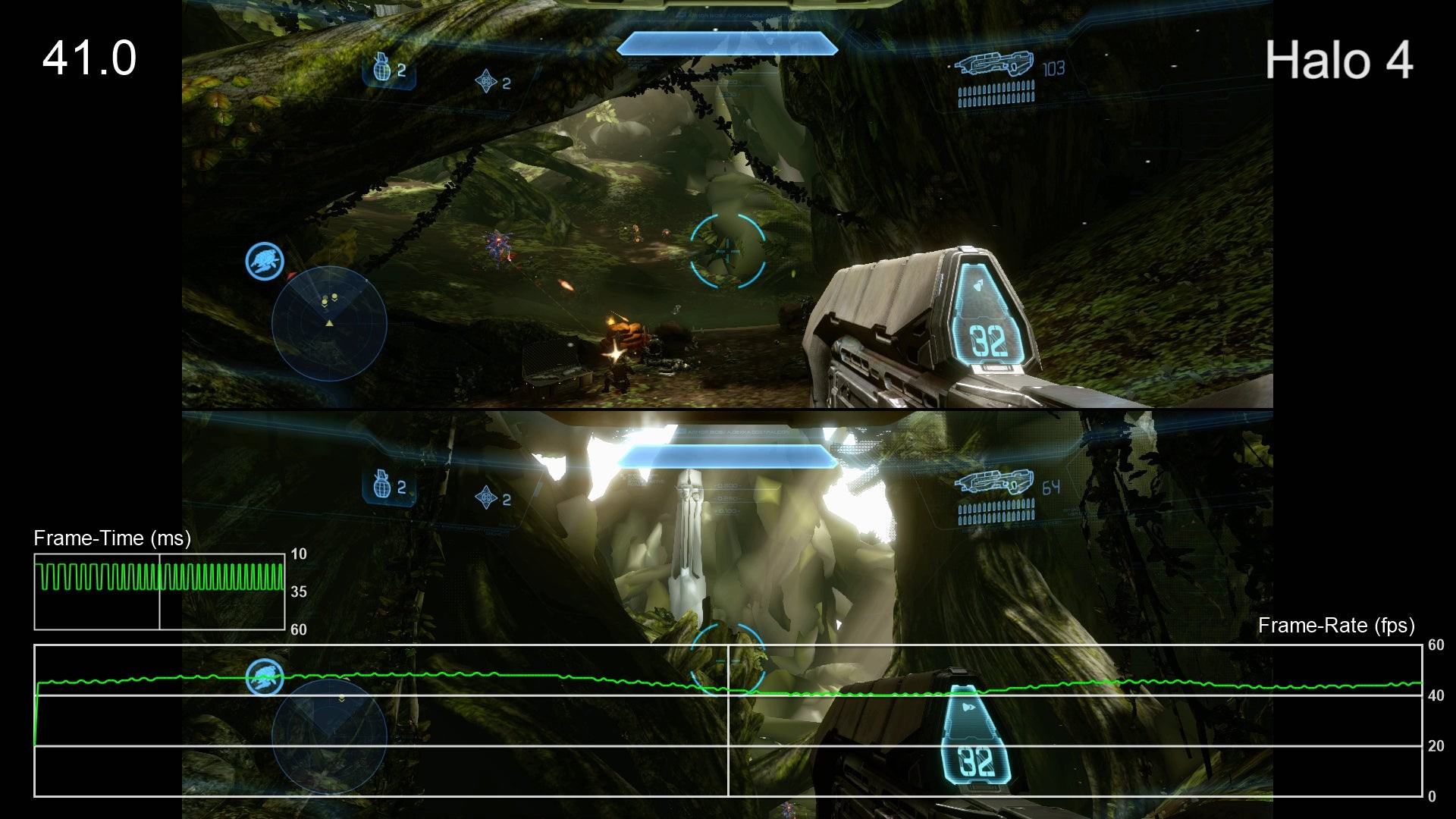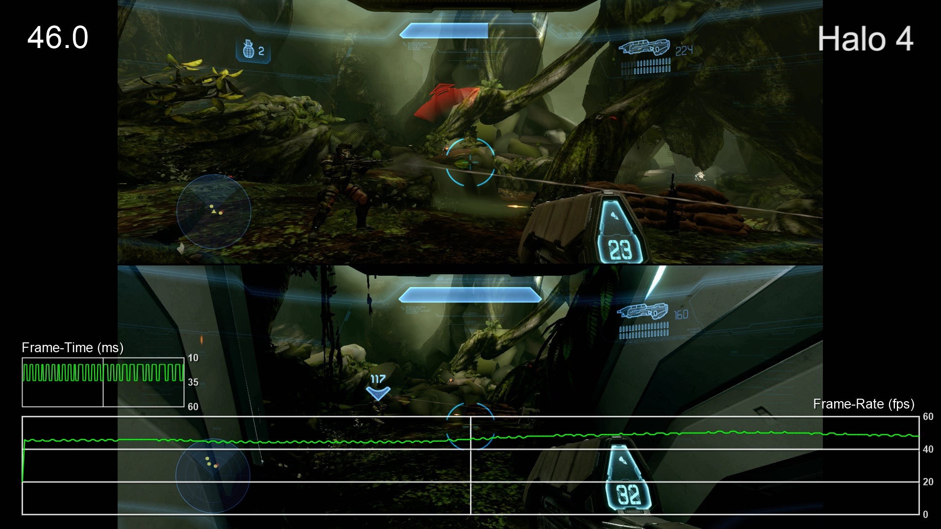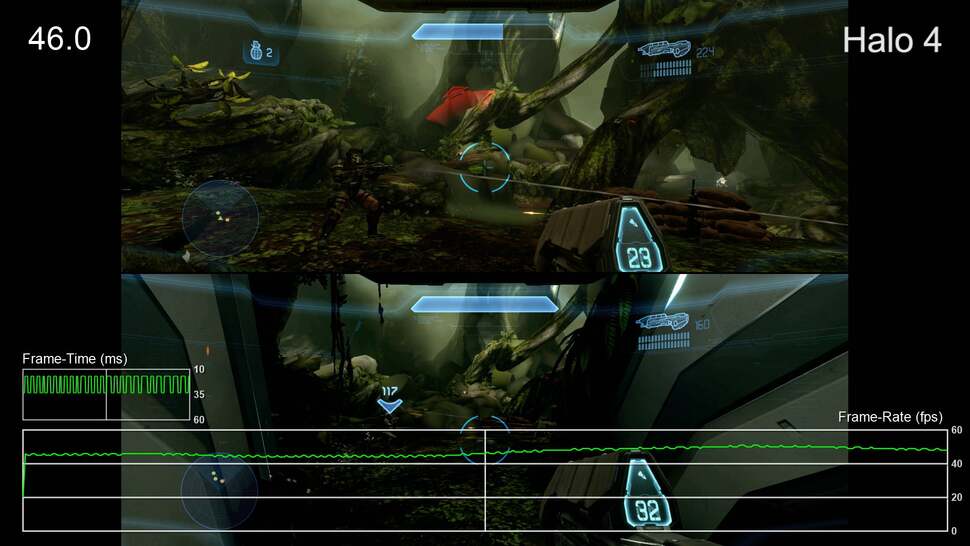 - We're saving the worst for last here. The frame-rate in Halo 4 split-screen is bad to the point that we'd argue that it's not really playable. Moments where dips occurred in single-player are much worse here, but even those sections that were reasonably smooth fail to come close to reaching a solid 60fps. The most jarring issue here, however, is the insanely aggressive LOD system. Assets are drawn in as the player moves through the world but sometimes that leaves huge sections of the map without any texture detail at all - remarkably, there are times where you'll wind up fighting the Covenant against a backdrop of flat-shaded polygons. This is certainly a legacy issue related to the 360 version, though performance is bad enough in this mode that one has to wonder how it would have run without the aggressive LOD system.