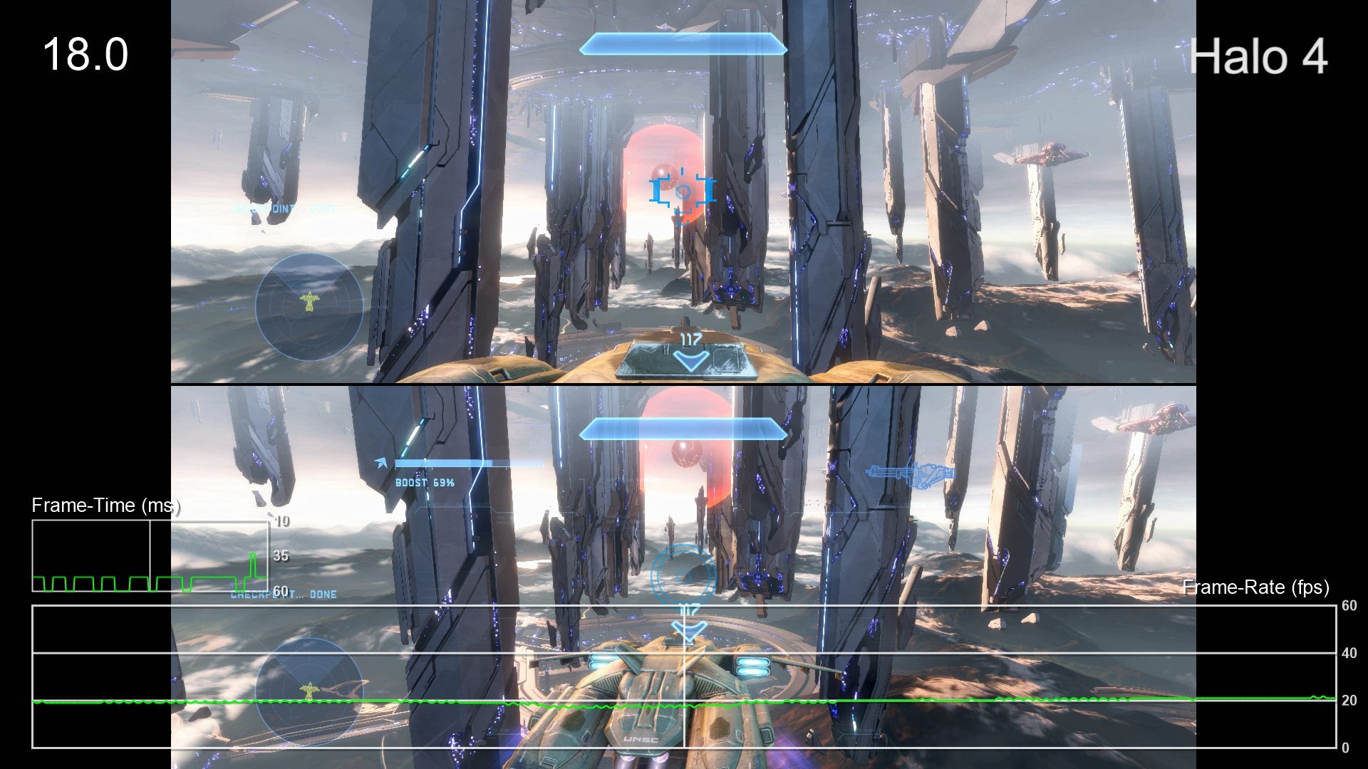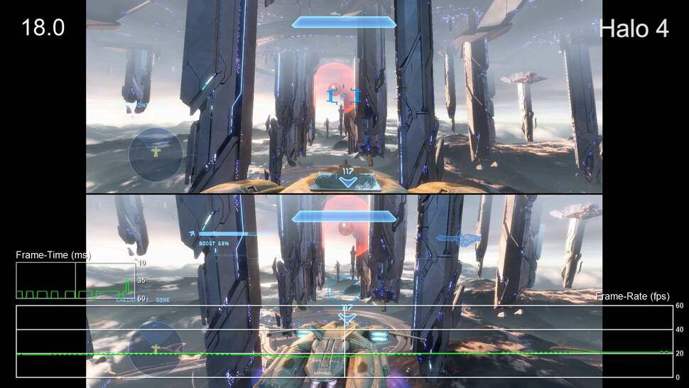 - Halo 4 aims for 60fps, as with the rest of the package, but fails to deliver a consistent experience. The game appears to struggle in two different areas - decompressing data while entering a new area and simply handling the load of heavy combat. Nearly any time the player walks into a new, large arena, the game engine seems to buckle under load, resulting in substantial frame-rate dips all the way to the 30s. These drops can persist for upwards of 20-30 seconds and definitely impact the initial moments of many battles. Even once that has settled, the performance often struggles to maintain a stable 60fps, producing frame-rates in the 50s pretty regularly. There are times when the game feels just perfect, of course, but these dips occur far too regularly for our liking, and there's the feeling that what could have been a stunning Xbox One conversion just feels a touch too unpolished.