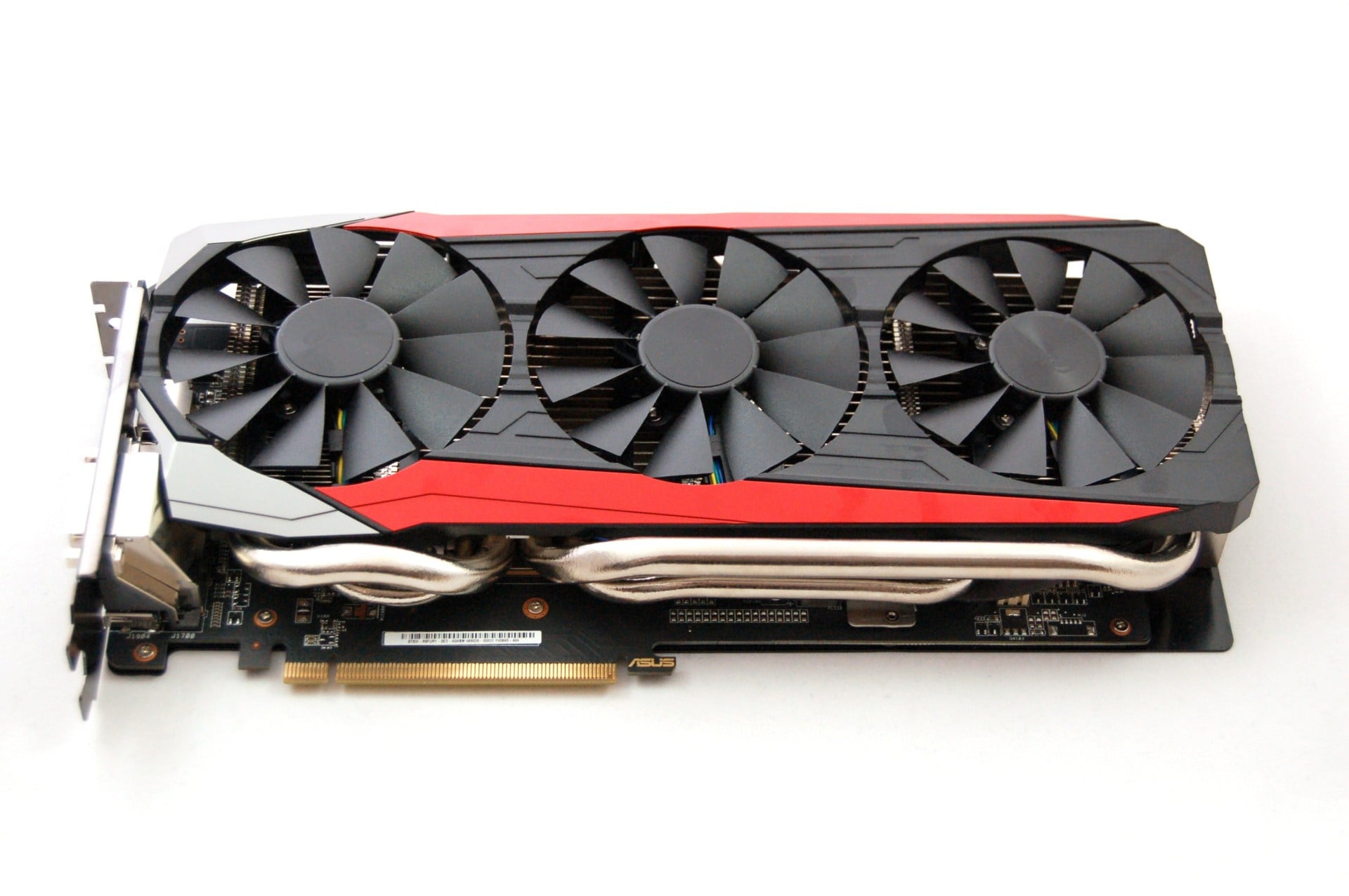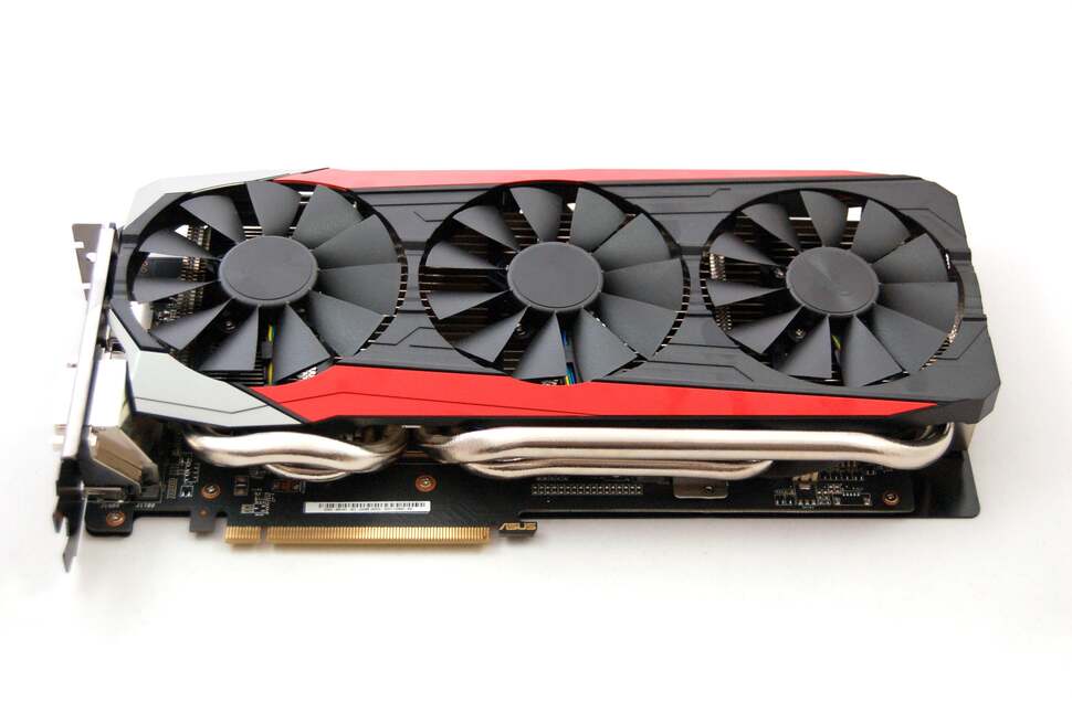 Perhaps the biggest difference between Fury and Fury X is the form factor: the svelte, small PCB of the top-tier product is replaced by a very large, more traditional PCB, smothered by a colossal heatsink and three fans (but on the plus side, we get back the DVI port removed from the Fury X). AMD has entrusted Fury design to just two manufacturers for now - Asus and Sapphire - and we have the former board here on test.