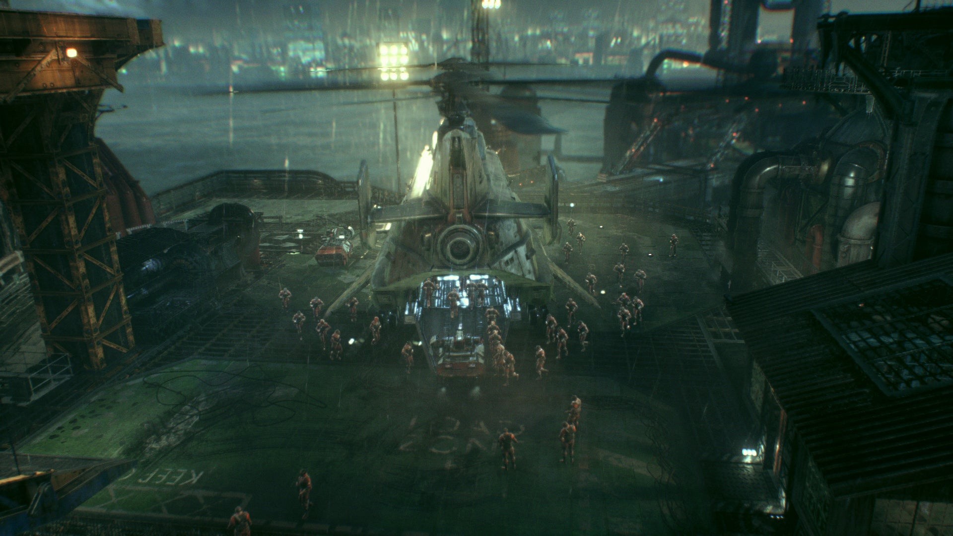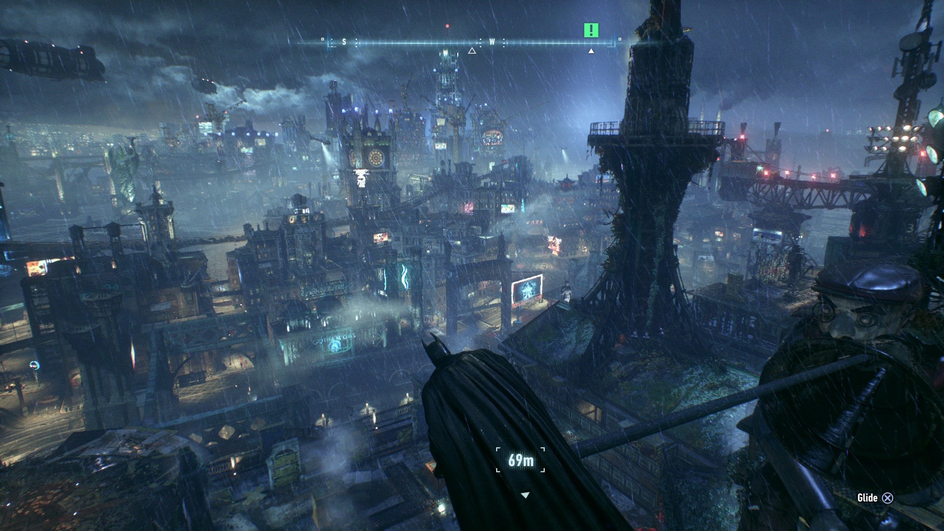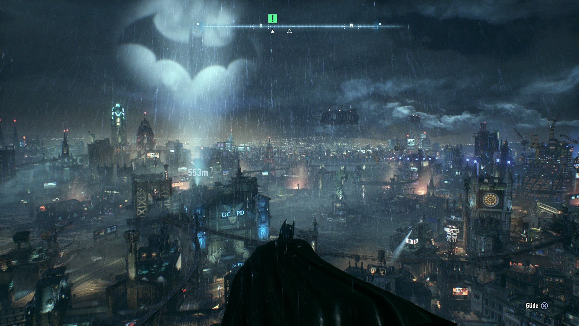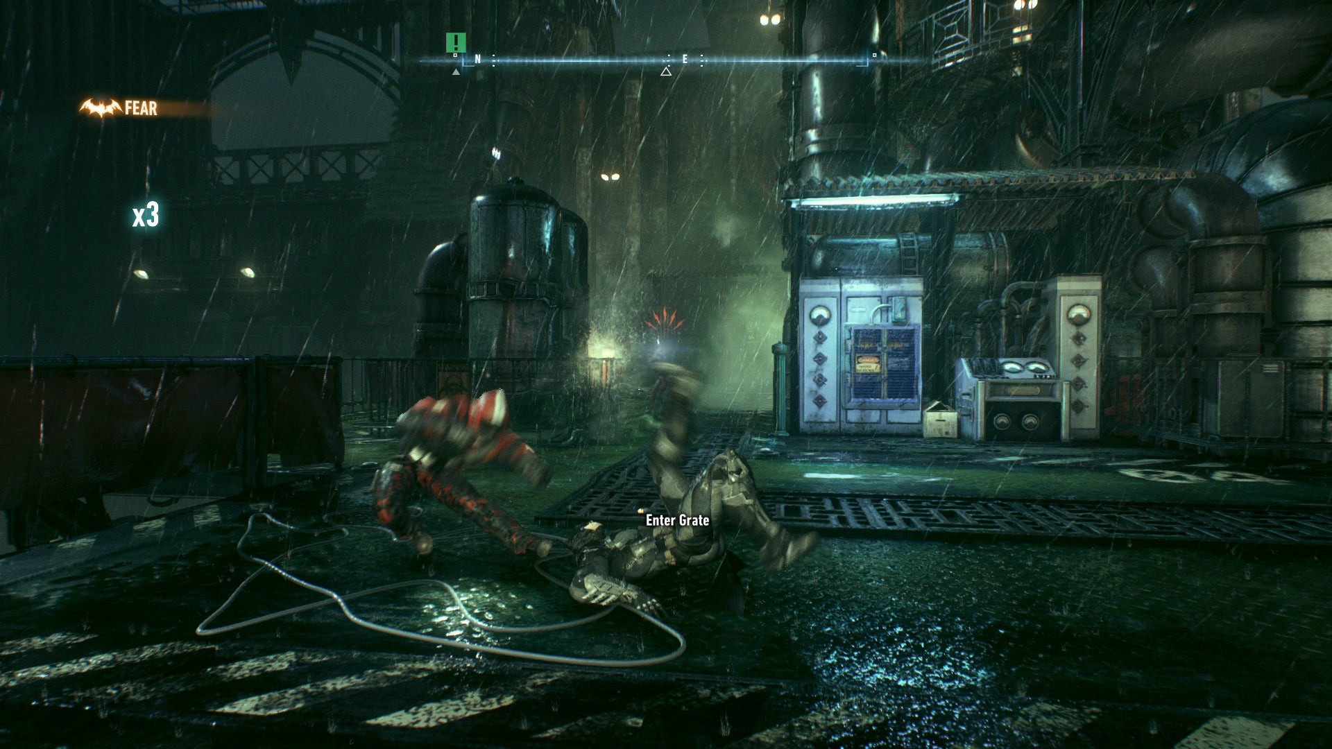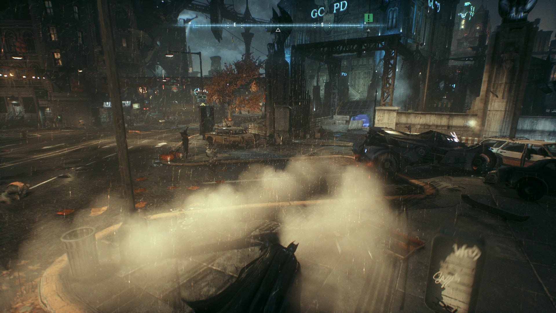 The result is a slicker, more cinematic look to Arkham Knight than was ever possible on last-gen hardware. The game also aces the last PC release via some impressive atmospheric effects, adding in heavy rainfall and rising plumes of smog across the distant city streets. Gotham City is noticeably drenched from top to bottom; unlike the light patter of snowflakes falling in Arkham City, rain weighs down heavily on Gotham with splashes and ripples on the road surface. Impressively, rain is also properly shaded by nearby lighting, tinged to whatever neon colour it passes by.