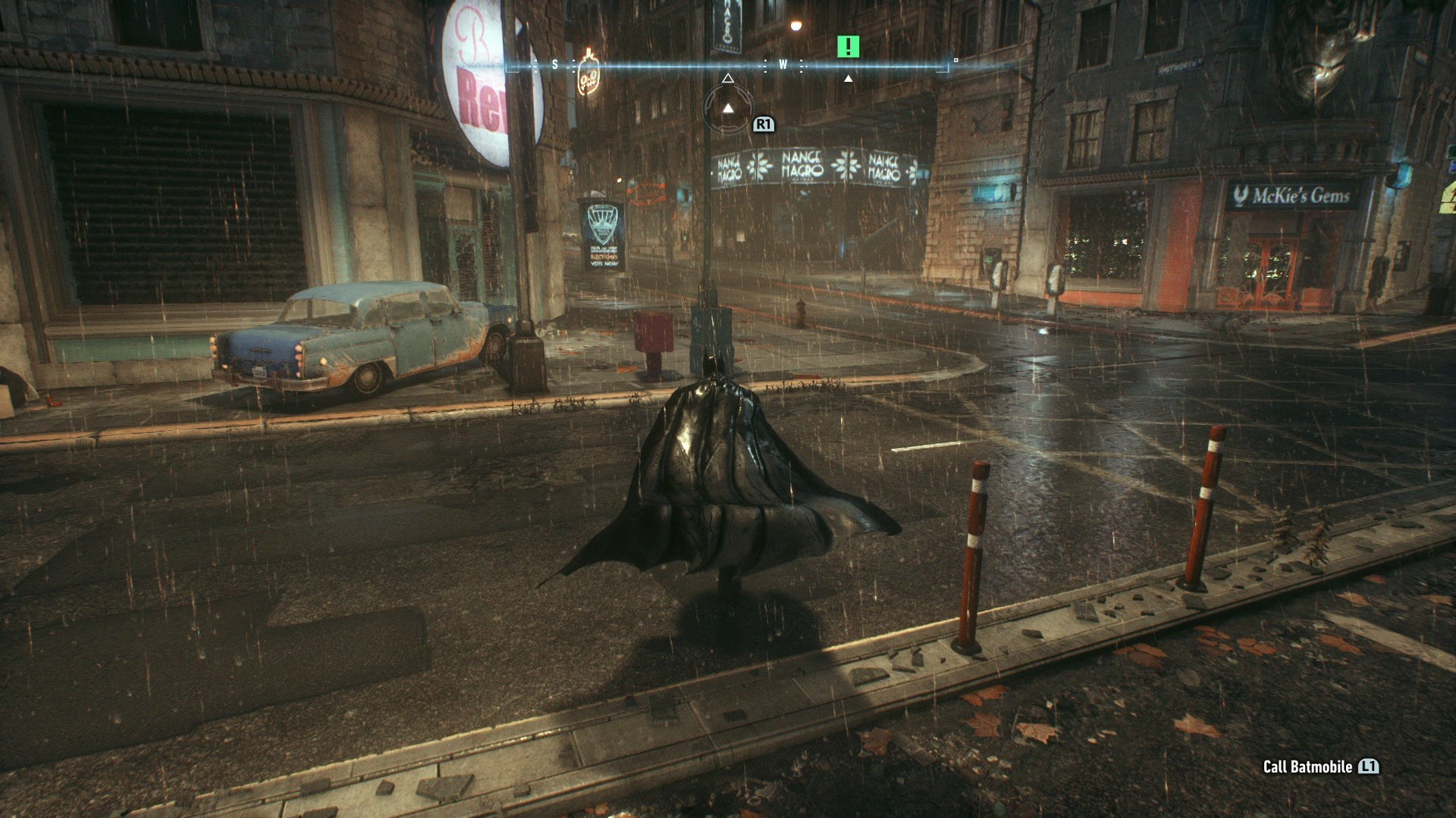 Arkham Knight's physics mark a huge upgrade for the series as a whole too. A destruction system is now put in place across the city's buildings, primarily to give the Batmobile a 'wrecking ball' effect as it clips wall edges. Pillars and building-sides crumble as it cut corners sharply as a result, a satisfying effect that has concrete chunks fly from the point of impact. On foot, Batman's cape now also boasts much-improved cloth physics via Nvidia's PhysX; each turn prompting a more nuanced whip and curl to the fabric that we also see on the city's flags.
