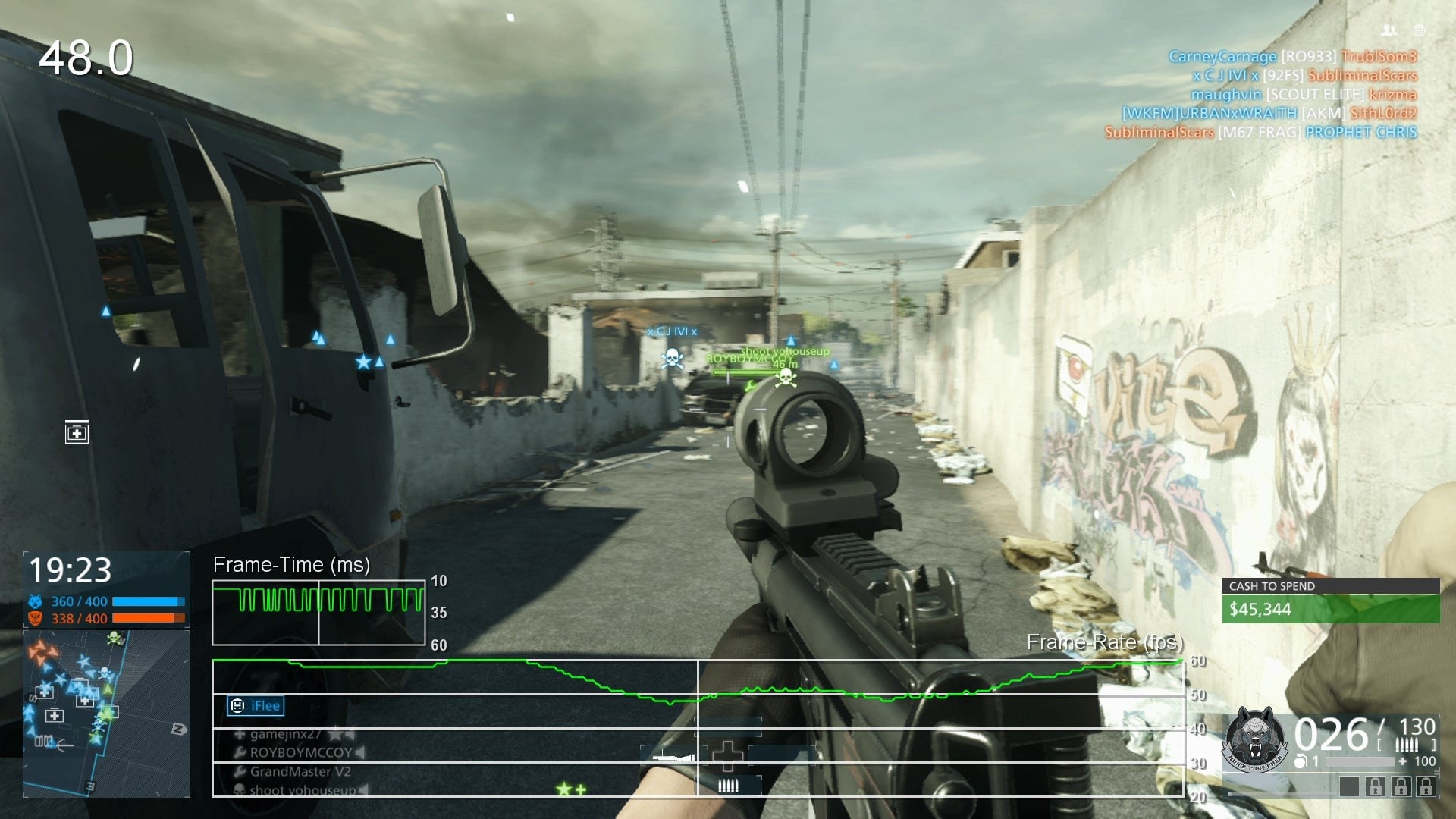 It makes a noticeable difference in practice. This is also the case for the Hollywood Heights stage; sparing a few blips southward, this medium-sized map holds at a smooth 60fps until each team fills out the ranks. However, it never quite reaches the same lows as The Block.