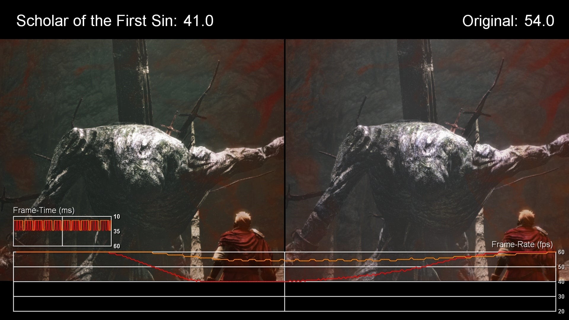 The 260X holds up surprisingly well - though, curiously, tackling the exact same stress-points in the original DirectX 9 version brings out less severe dips overall, the lowest point of 40fps seen when entering foggy entrances in Things Betwixt. Given the added lighting properties around effects in this DirectX 11 edition, it's clear rendering these aspects on low-end GPUs takes an extra toll, but never enough to distract. One exception is the cut-scene introducing The Last Giant boss, which has the 260X waver between 40-60fps on both releases, where the newer edition struggles most. Across a matching 2,140 frame sample with v-sync engaged and a 60fps cap, the original version drops just 10.4 per cent of its frames, as compared to 14.7 per cent with Scholar of the First Sin. Thankfully both run smoothly at 60fps again once gameplay resumes.