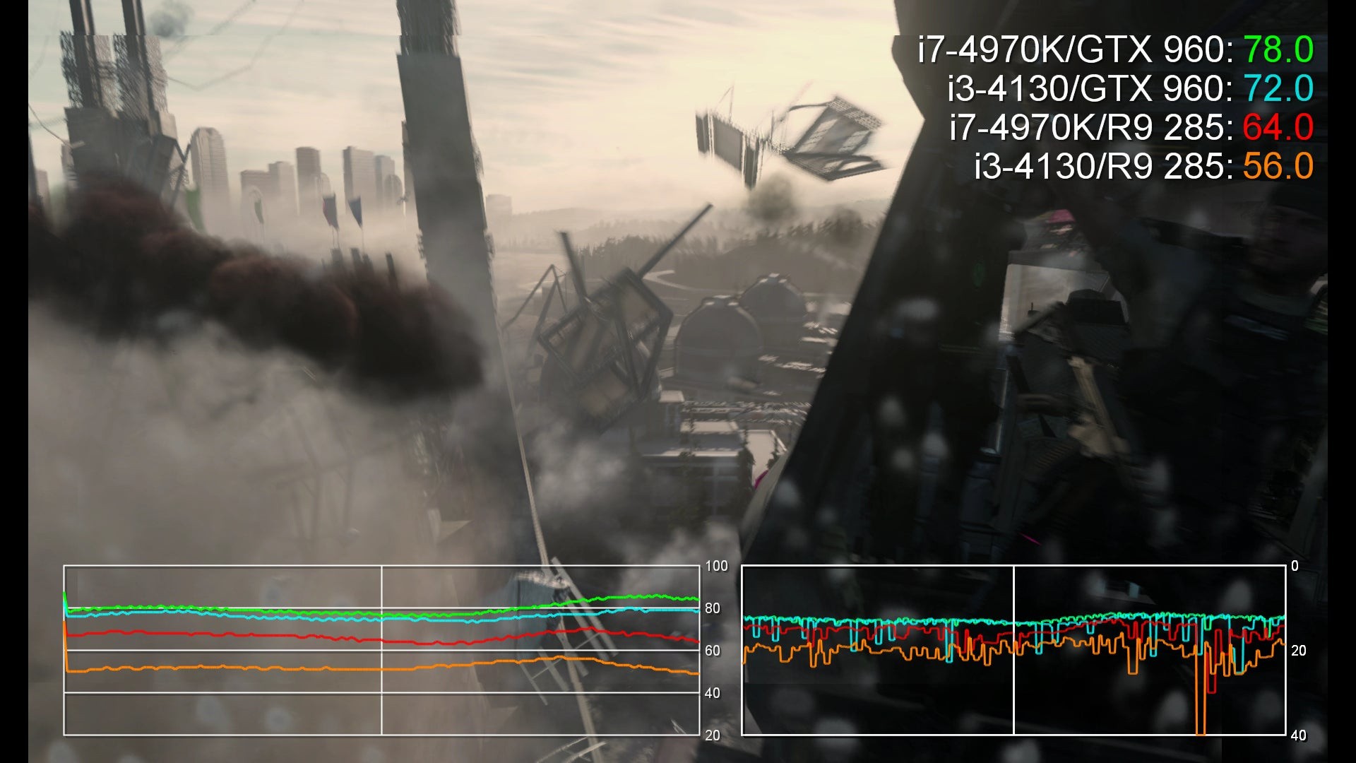 Overall, this is a topic that needs more exploration on a wider variety of CPUs. It's not so easy to test because sequences need to be found that specifically target CPU load, and historically benchmarking runs concentrate very much on GPU performance. Our range of test processors is limited, but we have confirmed similar behaviour by lowering clocks and disabling two cores on an i7 on an entirely separate PC. In the here and now, we'd say that if you're an i3 owner considering a graphics card upgrade, the established GPU hierarchy might not work for you in choosing the best possible product. To give some idea of the extent of the issue, this is the moment where a GTX 750 Ti outperforms a significantly more powerful R9 280 in Call of Duty: Advanced Warfare in gameplay conditions where 1080p60 at PS4 quality settings is the target.