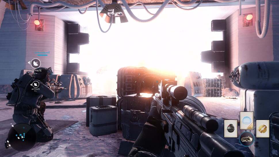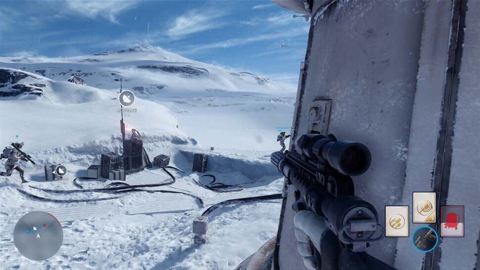 Even with the Hoth demo's mostly white colour palette, there are neat visual touches not seen in the original teaser. Parallax occlusion mapping features heavily on this icy map for example, with footprints and indents lining the base of the trenches to give each surface a three-dimensional look. Backed by a specular component, the texture mapping for snow is convincing, especially as it's pitted against the Frostbite 3 engine's lighting model.