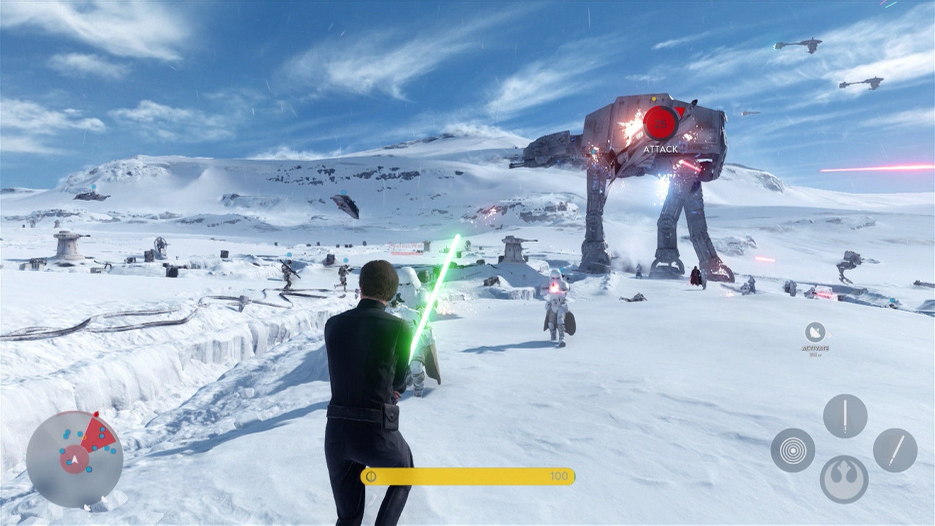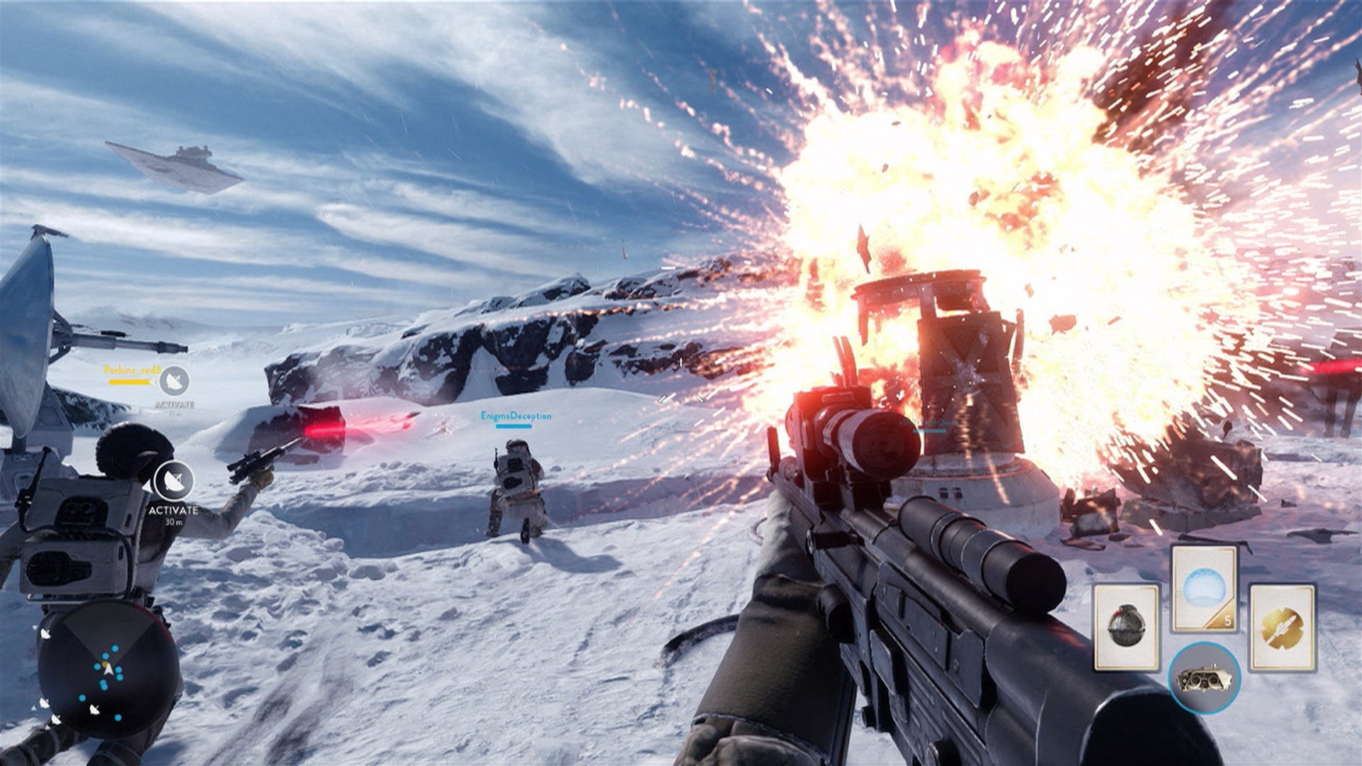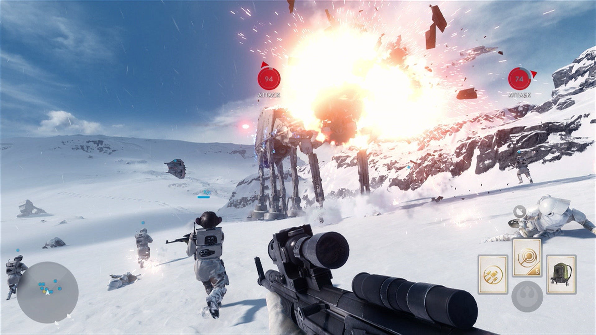 DICE's gravitation towards massive environments, vehicles and destruction still features, though notably with a slight re-balance to cater for the style expected of the Battlefront series. Between the teaser and PS4 gameplay demo, physics-based damage across the map evidently gets a lesser emphasis than in Battlefield 4 for example - something acknowledged by the team as a design choice. Besides the shrapnel flying from downed AT-AT walkers, or the flowing cloth physics on Rebel Alliance cloaks, actual use of physics is fairly limited. Future maps may introduce more procedural chip-damage in the vein of the DICE's other series, but for now this is an element that's been downsized in favour of a push for more concurrent vehicles.