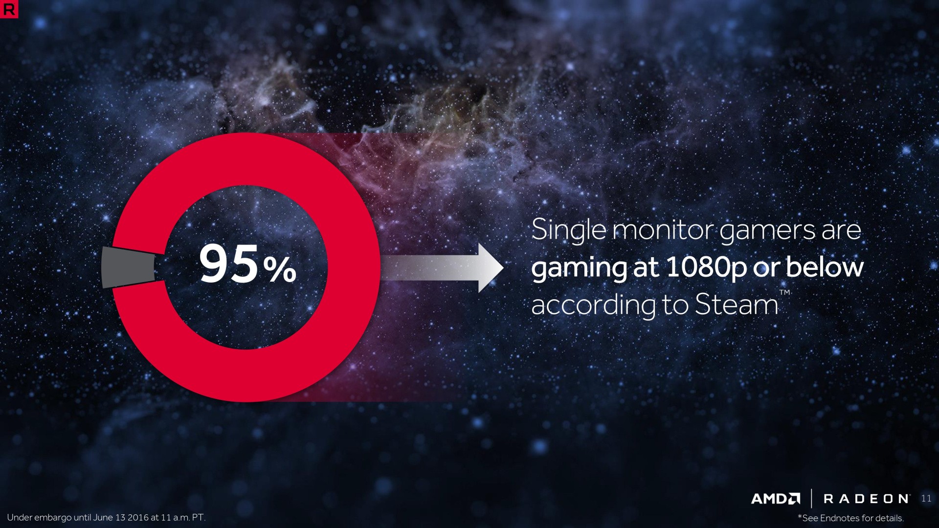 But the graphic above from AMD is telling. According to the Steam hardware survey, 95 per cent of PC gamers are using 1080p or lower resolution screens. 1440p and 4K displays barely register, neither failing to hit even one per cent of the audience. 4K may well gain more traction in the living room, but the inescapable conclusion from the PC market is that the majority of gamers simply don't care about higher resolution screens. And with that in mind, the RX 480 is AMD's audacious play at targeting the mainstream PC gamer - and there is some irony that the same core technology is fuelling Sony's 4K aspirations.