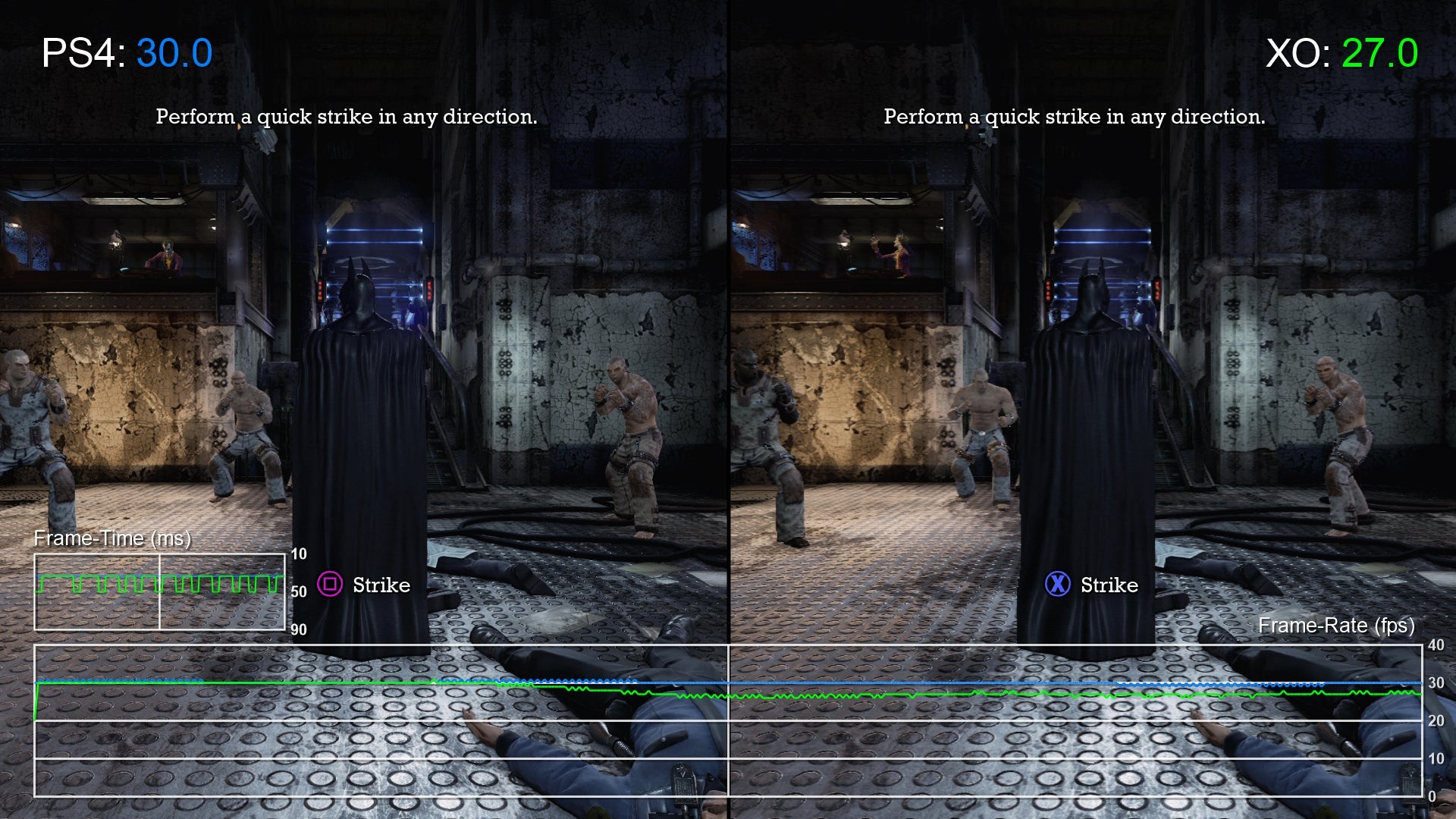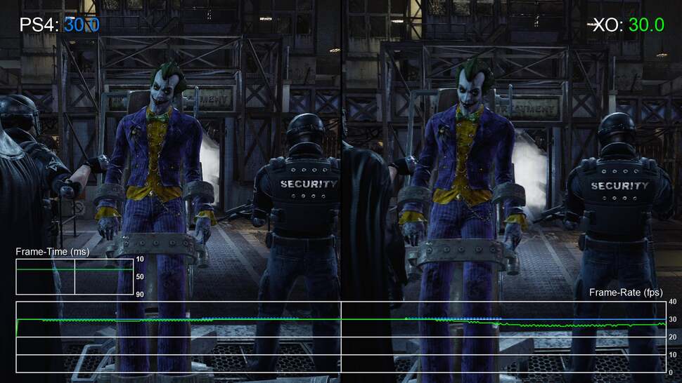 Perhaps more jarring is the fact Xbox One can't hold this 30fps line in seemingly simple areas. Moving towards a new corridor of the asylum, we see drops to as low as 22fps, likely as a result of streaming the next spot, which only increases the velocity of the frame-time spikes. These drops blight Xbox One's delivery of the game from the word go: the moment the Joker escapes and you're fighting your first trio of enemies it's already sat at the 25fps line while PS4 turns in an oddly frame-paced 30fps. This is a huge disappointment, especially given the linear nature of the first game in the Arkham series.