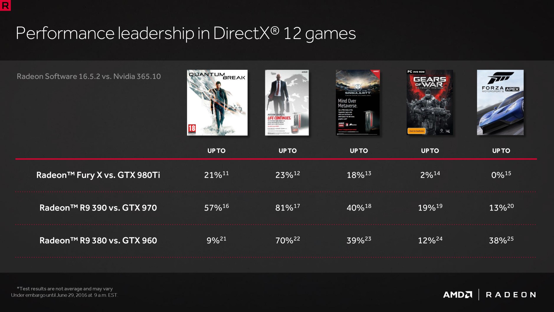 If this all sounds rather pessimistic in terms of AMD's longer term prospects, it should be balanced with areas of the Radeon technology that show evidence of clear advantages over Nvidia's technology. AMD is claiming performance leadership in DirectX 12 gaming - a massively important growth area - and has come up with the table below to demonstrate the extent of its domination.