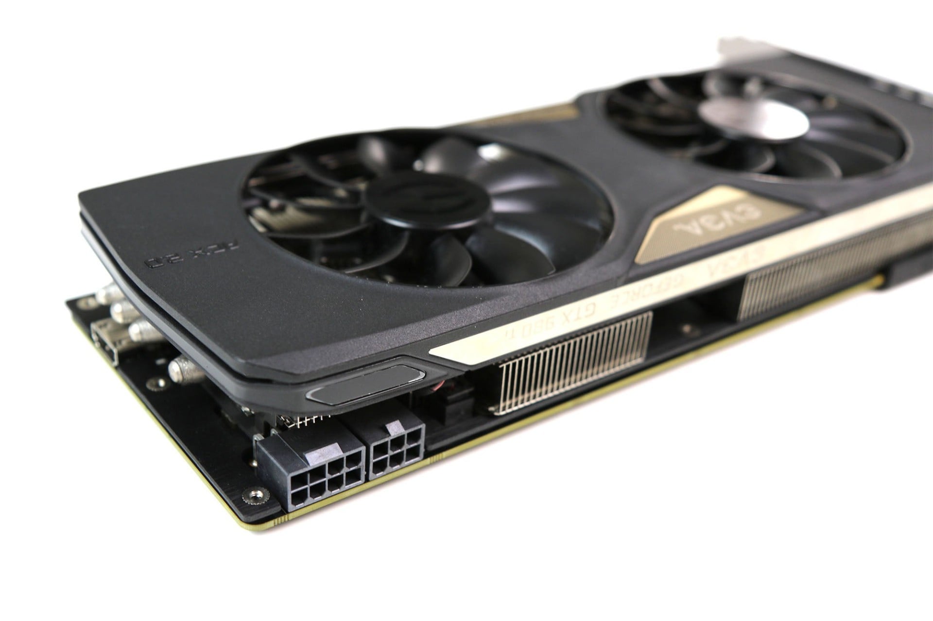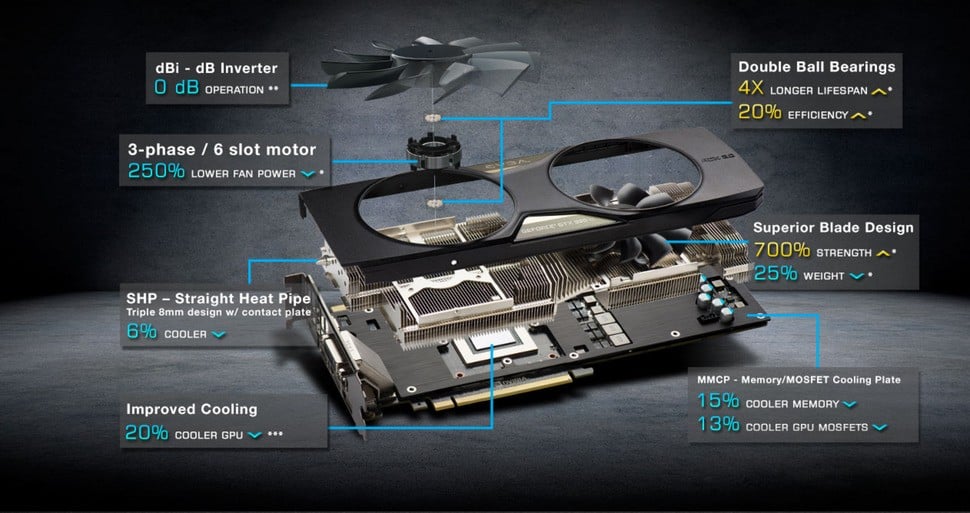 But other than that, it is a standard GTX 980 Ti - running at reference clocks no less. EVGA sent us the ACX 2.0+ version, and it's a lovely card with some decent features, including an energy efficient three-phase, six-slot motor, double ball bearings and a refined blade design offering more heat dissipation with lower weight. The PCB features a memory and MOSFET cooling plate, and 0db silent operation when the GPU temperature is under 60 degrees celsius. EVGA's aim here is to reduce board power consumption as much as possible, the idea being that this additional energy can be re-routed into your overclock.