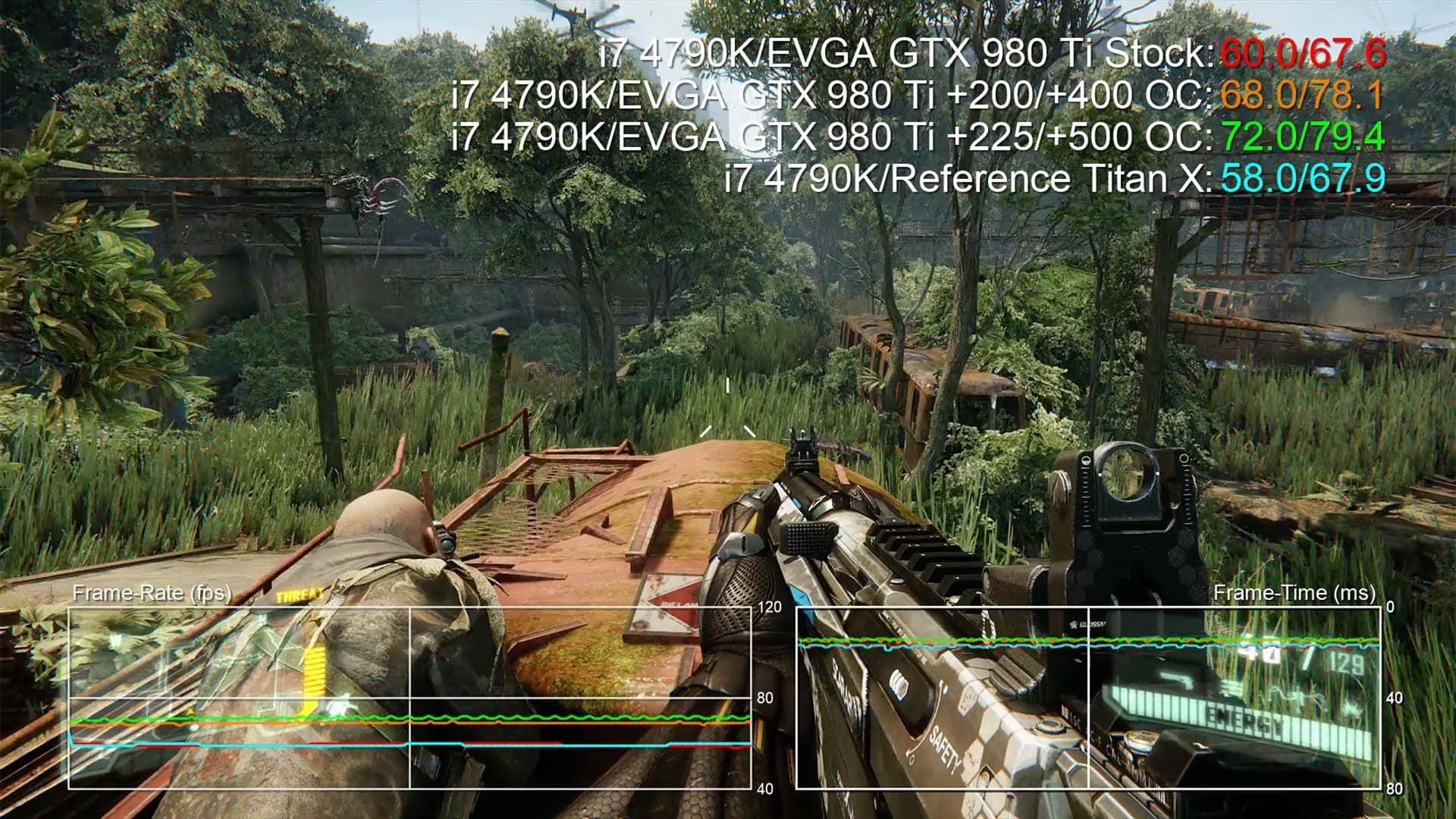 Business as usual as we run Crysis 3 maxed out at 1440p with SMAA T2X anti-aliasing. The stock GTX 980 Ti offers effectively identical performance to the reference Titan X, while overclocking offers big gains. However, note that a rock-solid stable +200MHz core/+400MHz RAM OC offers the vast bulk of the performance bump, while the 'bleeding edge' OC offers very little extra.