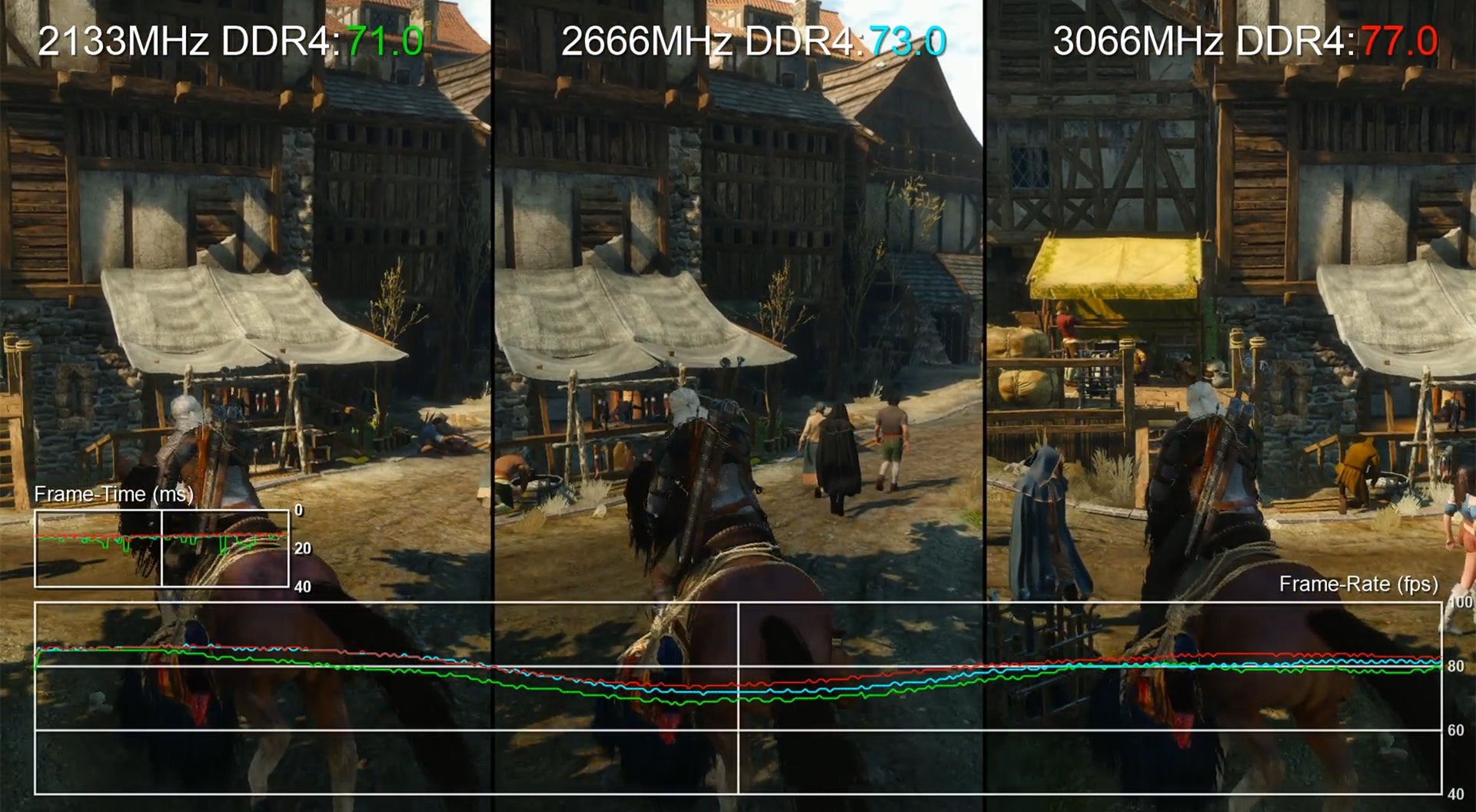 Our tests pair a Titan X with the i5 to push CPU and memory bandwidth to the forefront. But even with a more realistic pairing, faster RAM improves performance. Here we see the stock i5 6500 paired with an overclocked GTX 970 on The Witcher 3. Faster RAM improves lowest frame-rates in particular.