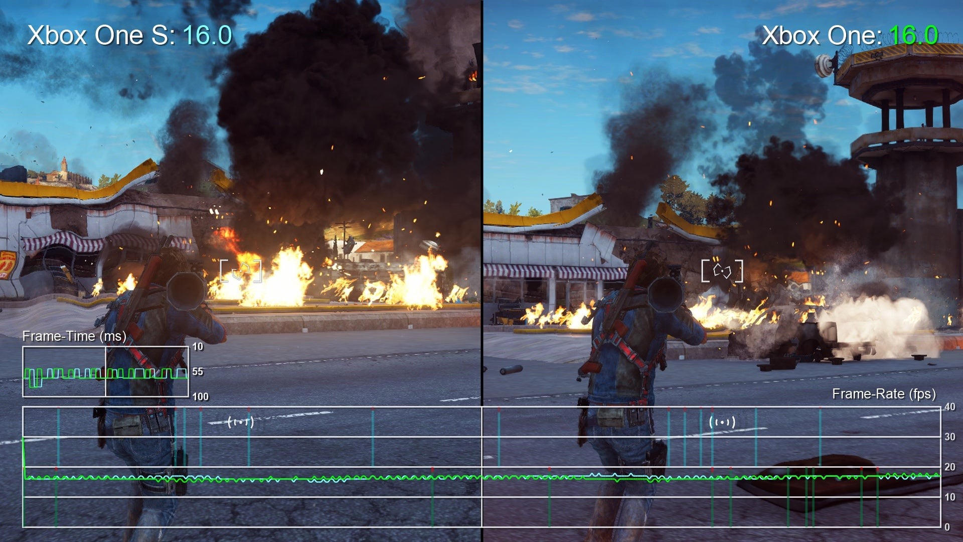 A re-test on the newer Xbox One S gave us a glimmer of hope, where its 7.1 per cent GPU overclock stood a chance at alleviating at least some of the strain we see here. But the reality is there's no perceptible performance benefits when re-testing Just Cause 3 on the newer model. Under the same conditions, the original machine's drop to 16fps still kicks in at the same stress point in matched gameplay.