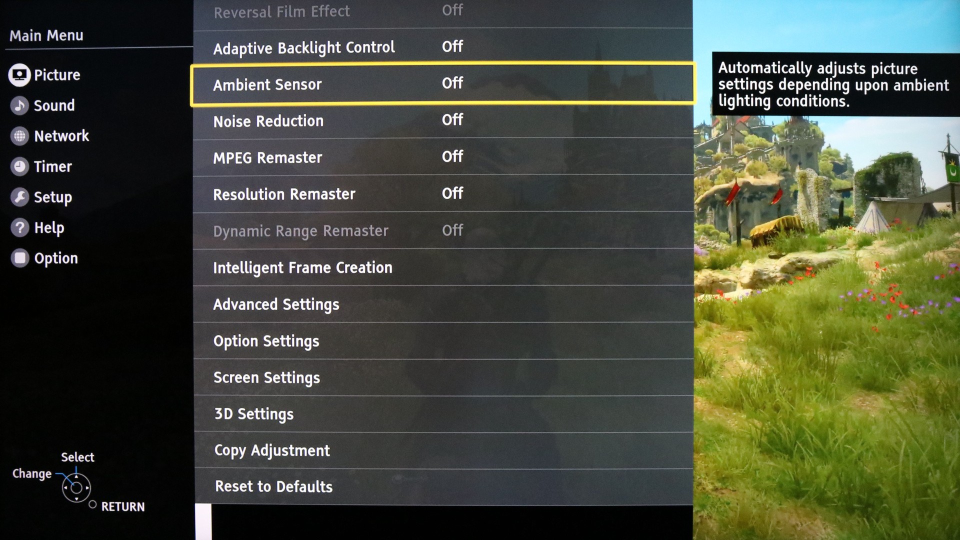 Importantly, the use of a dynamic backlight helps to enhance dark and mid-brightness scenes, helping to deliver depth and three-dimensionality to HDR images when bright highlights are not called for. That said, the DX750's implementation is far from perfect, and with the adaptive backlight control on minimum we often notice fluctuations in light output in the same scene - especially where brighter elements move in and out of the same shot. It's also worth pointing out that without precise local dimming, contrast is still impacted in mixed brightness scenes, with elevated black levels compare to an SDR presentation. While the amount of depth and high-end pop clearly surpasses an SDR presentation, mid-range depth is sometimes sacrificed to achieve this.